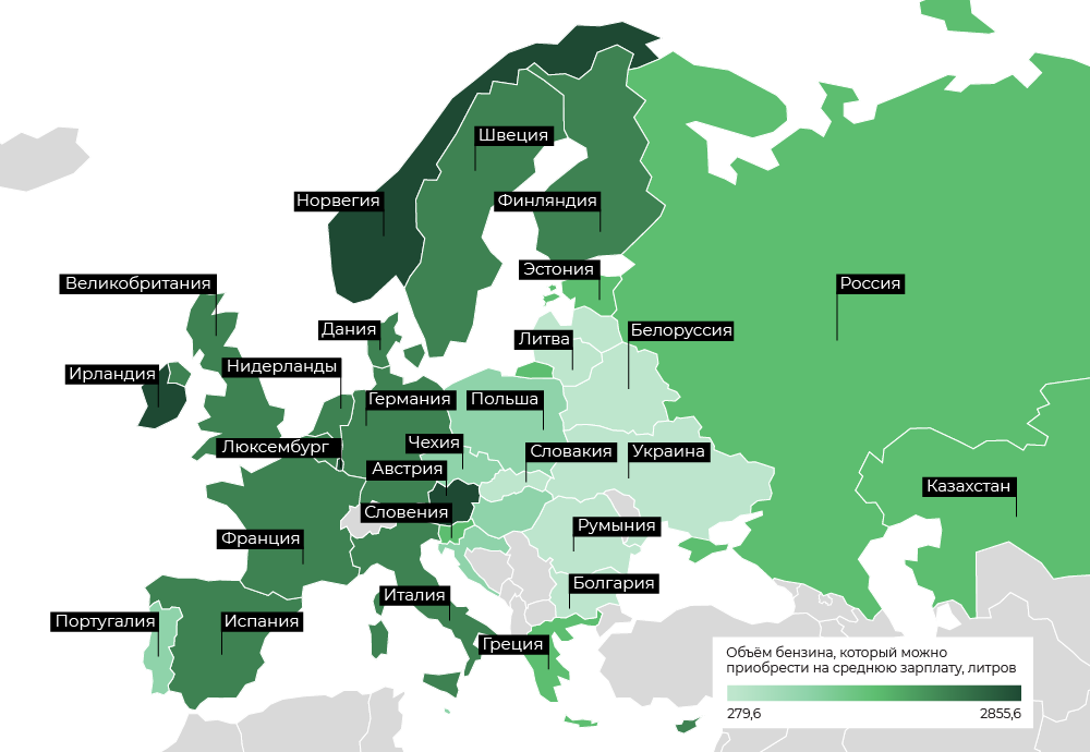 Издание отмечает, что при составлении рейтинга использовалась официальная статистика по ценам на 95-й бензин на начало июля 2019 (для Норвегии и Украины — по итогам мая). На среднюю зарплату белорус может купить 558,3 л 95-го бензина. Это в 4 раза меньше, чем средний норвежец и почти в 2 раза меньше среднего россиянина.