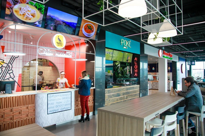 Food Hall разместился на шестом этаже ТРЦ в противоположной стороне от классического фуд-корта. Пул операторов подобран под стать формату: места получили нетривиальные заведения, которые готовят на месте из свежих продуктов, чаще по авторским рецептам. Средний чек невысокий – в районе 10 рублей.