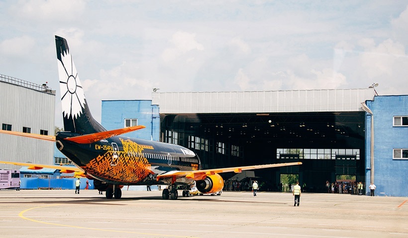Сегодня в минском аэропорту приземлился необычный лайнер «Белавиа». Он оказался раскрашен в стиле известной на весь мир игры World of Tanks с добавлениями элементов белорусского орнамента.