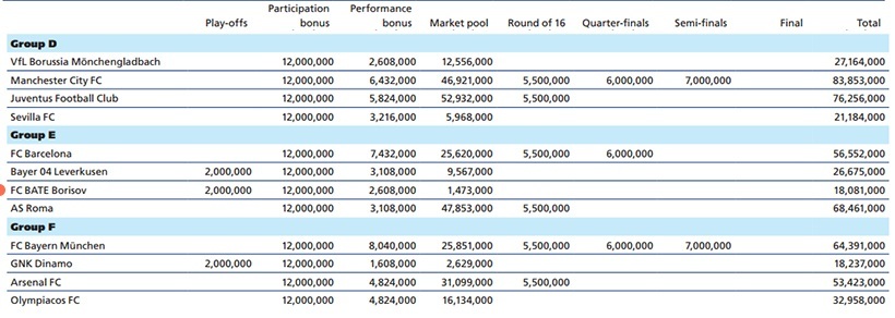 УЕФА обнародовала официальные данные о заработках клубов в сезоне Лиги чемпионов 2015/2016. Выяснилось, что белорусский БАТЭ получил ровно 18 081 000 евро.
