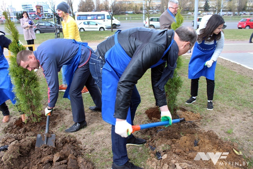 В эту среду у филиала «МТБанка» на Притыцкого, 79 кипела работа. Сотрудники финучреждения вместе с представителями предприятий, которые в нем обслуживаются, посадили здесь несколько деревьев.