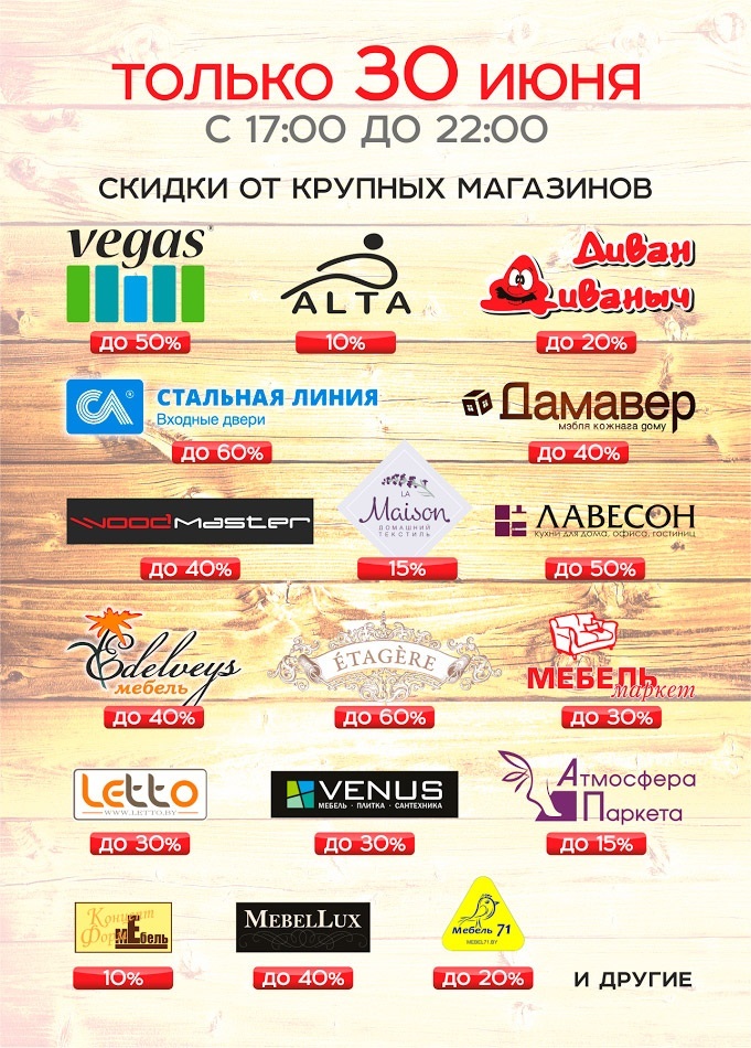 В ТЦ «Трюм» с 17 до 22 часов пройдёт мебельная «чёрная пятница». На один вечер магазины сбросят цены на кресла, диваны, кровати, матрасы, столы, двери и сантехника. Распродажи устроят MebelLux, «Диван Диваныч», «Эдельвейс», Letto, «Дамавер», Etagere, Alta, vegas, «Лавесон», «Мебель-Маркет» и др. Магазины снизят цены до 50-60% как на выставочные образцы, так и на товары из каталогов.
