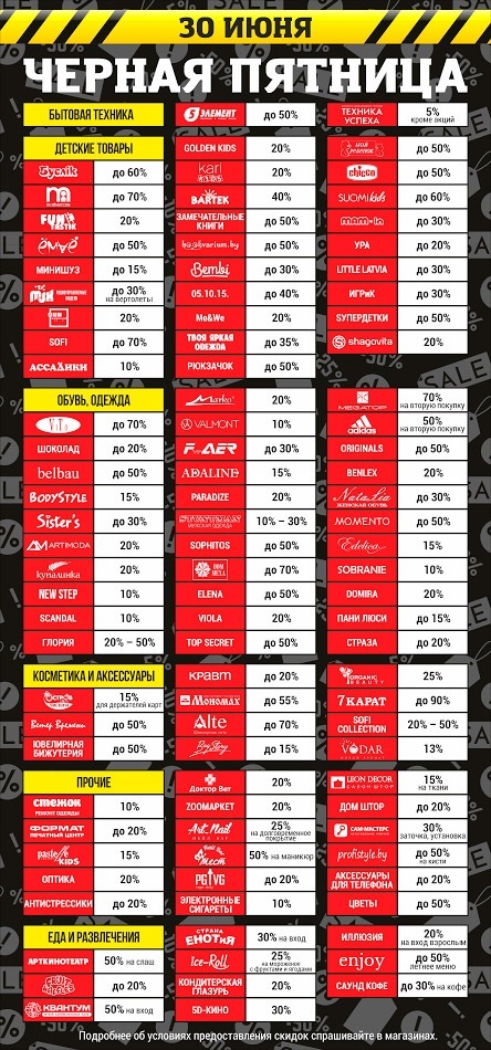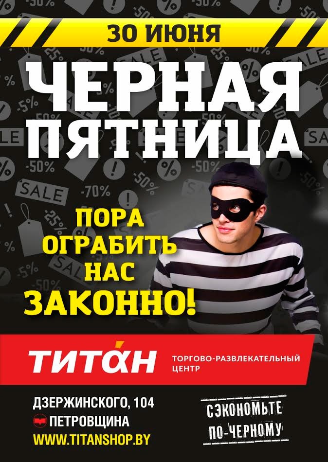 В Минске 30 июня пройдёт «чёрная пятница». Масштабные распродажи устроят сразу два торговых центра: ТРЦ «Титан» сбросит до 70% цены на одежду, детские товары и бытовую технику, а в ТЦ «Трюм» резко подешевеют предметы мебели и интерьера, рассказали организаторы.