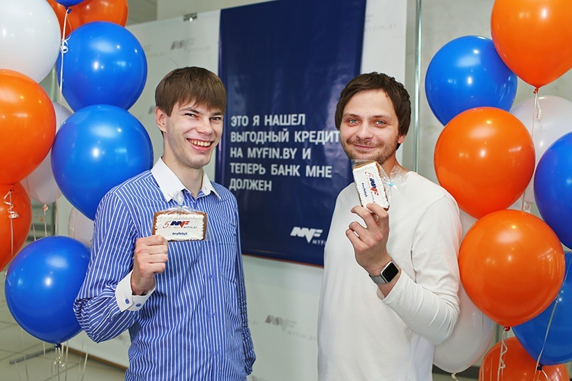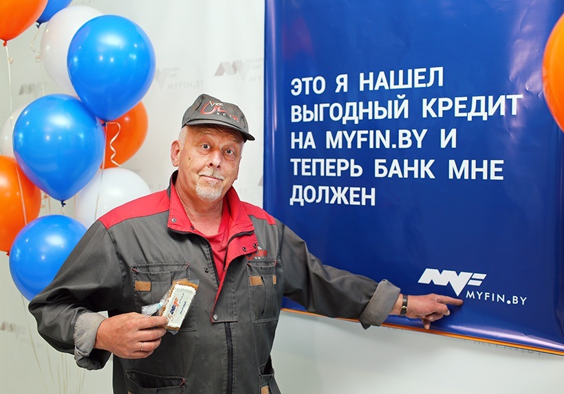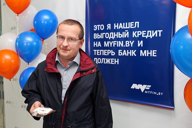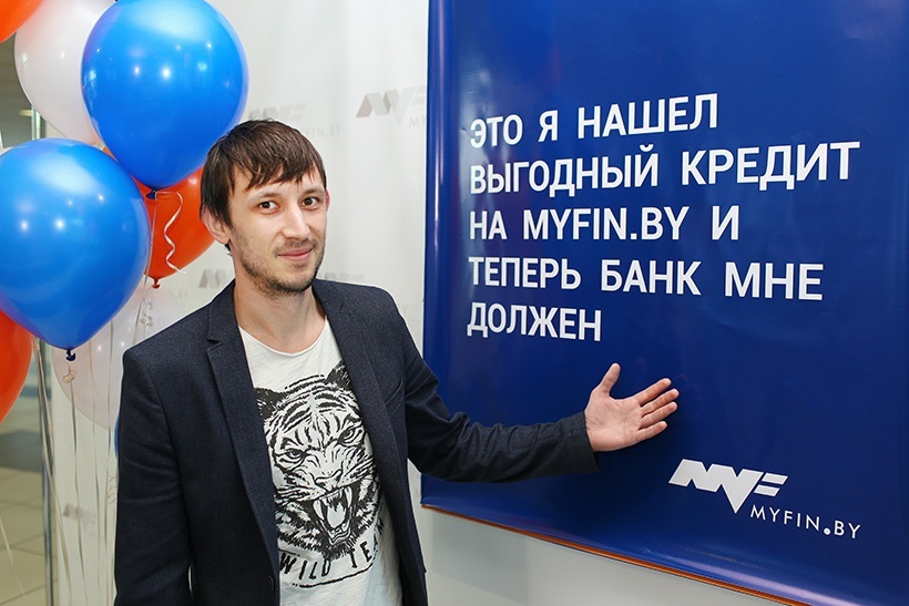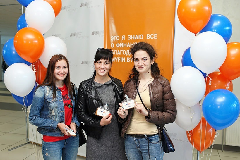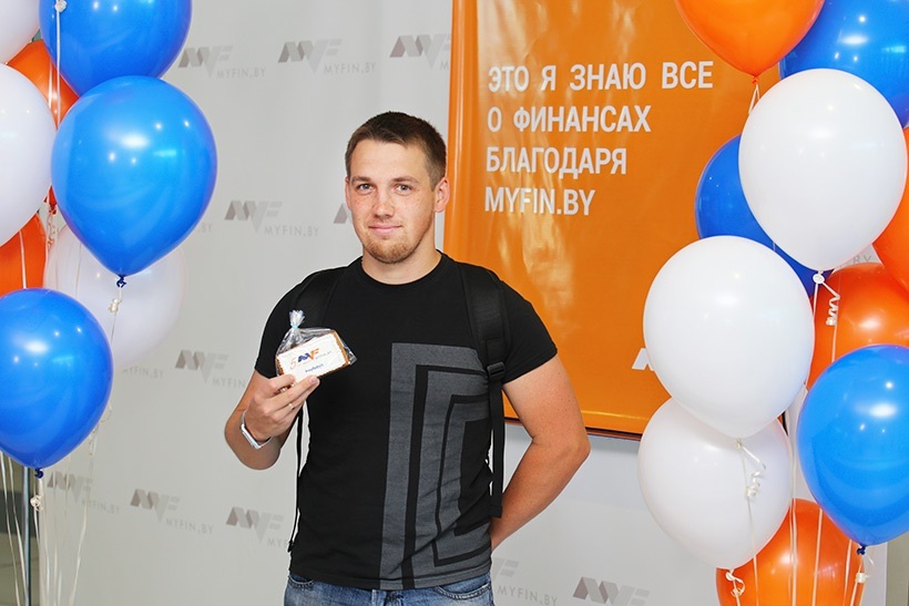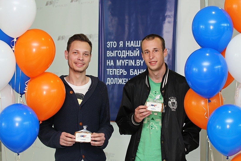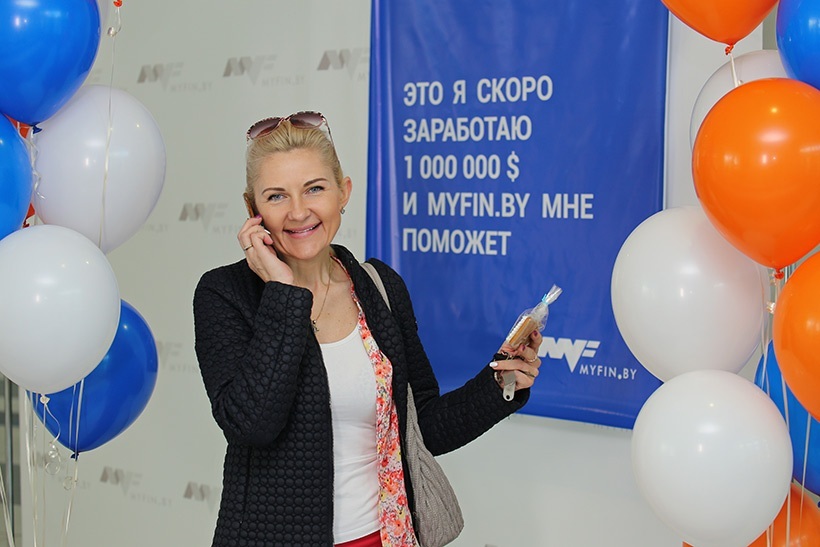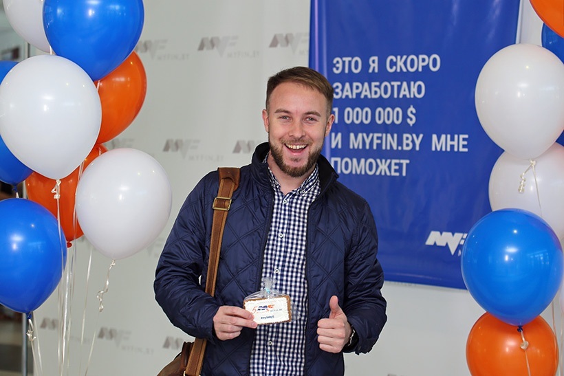 Получив их, работники и посетители бизнес-центра также с удовольствием фотографировались на фоне плакатов с надписями «Это я нашел выгодный кредит на Myfin.by и теперь банк мне должен», «Это я скоро заработаю миллион долларов и Myfin.by поможет» и так далее.