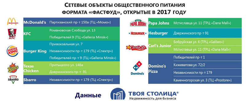 Что касается 2017-го, то по данным агентства недвижимости «Твоя Столица», за 8 месяцев открыто 17 объектов известных в мире сетей: McDonald’s, KFC, Burger King, Texas Chicken, Sbarro, Hesburger и Carl’s Junior. Два последних пришли к нам впервые.