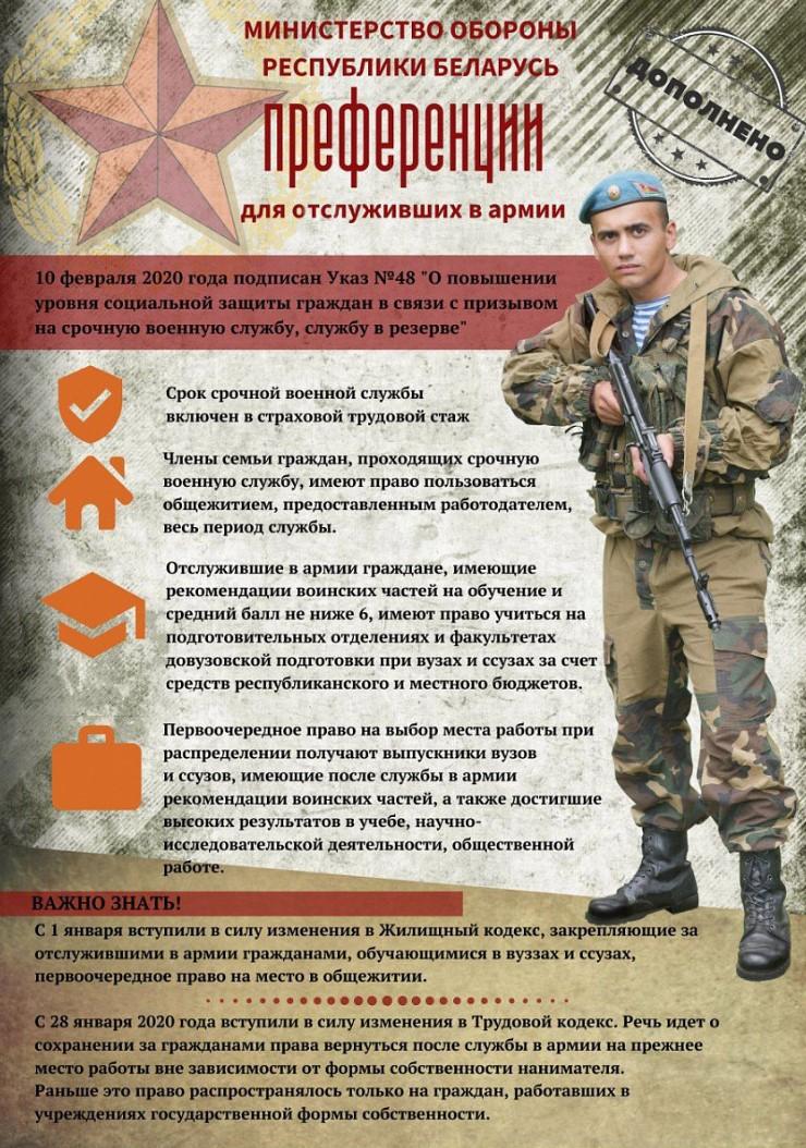 Дополнительные льготы для военнослужащих-срочников и резервистов предусмотрены указом № 48 «О повышении уровня социальной защиты граждан в связи с призывом на срочную военную службу, службу в резерве». Президент Беларуси Александр Лукашенко подписал указ 10 февраля, сообщает пресс-служба главы государства.