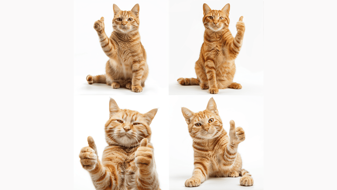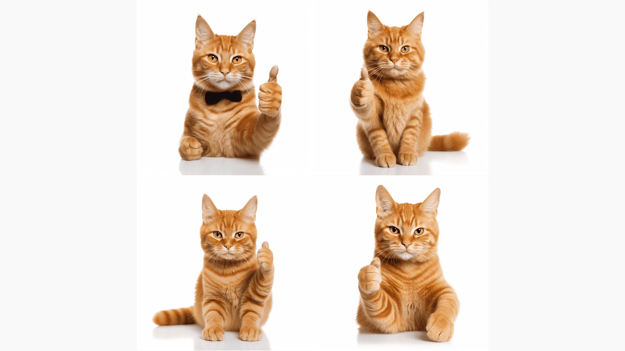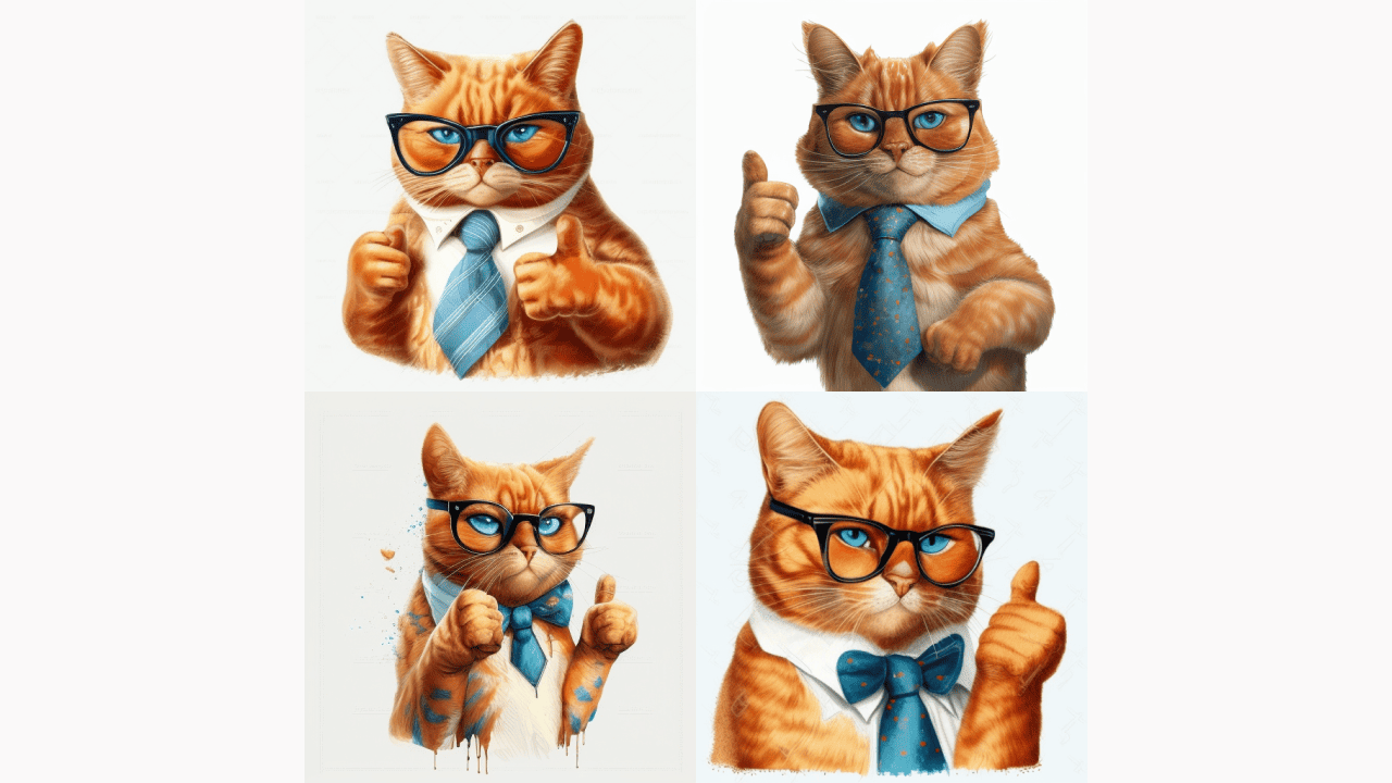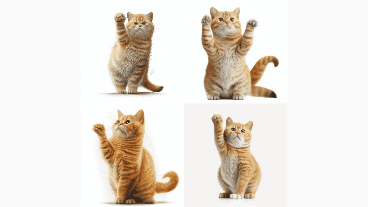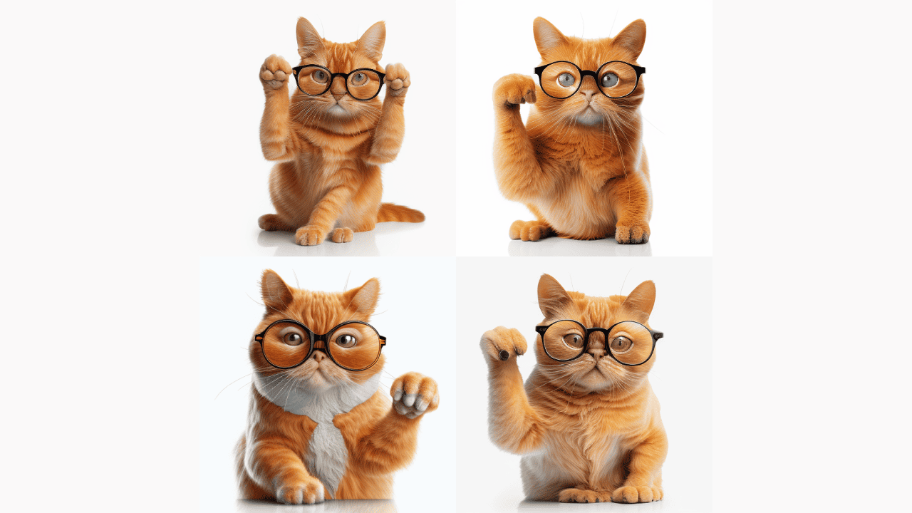 Оказалось, что писать задание нейронке лучше по-английски, чтобы получить лучший результат. Первые визуализации получились несколько странными: кот демонстрировал лишние лапы, а в линейке персонажей нарисовались абсолютно разные животные. В целом результат был не тот, на который рассчитывали. А эффект требовался с первого раза!