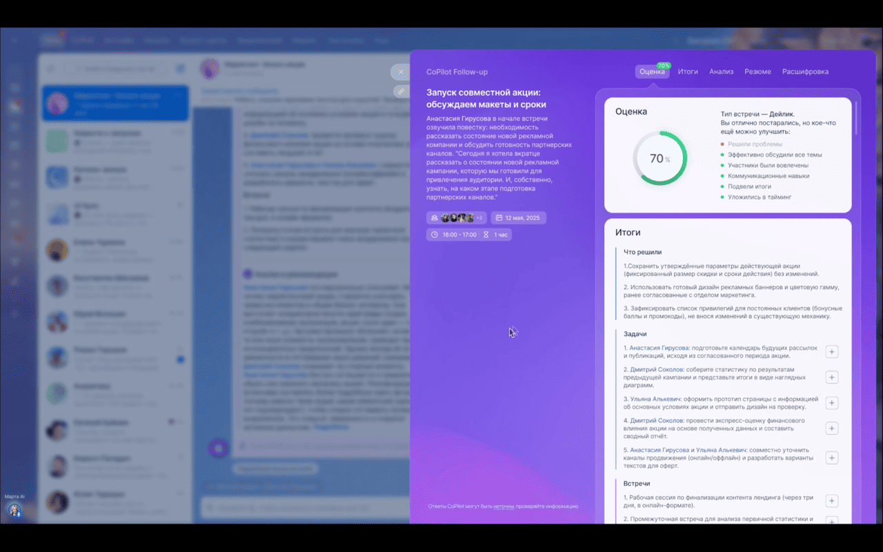 В этом релизе мы выпустили новый дизайн карточки с анализом встречи. А еще научили CoPilot глубже разбирать вклад участников и измерять эффективность встречи в зависимости от ее типа.