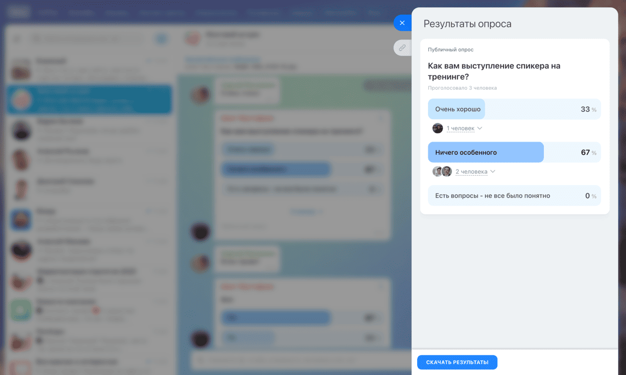 Опросы и голосования полезны, когда нужно быстро собрать мнение коллег и подсчитать результаты. Теперь в чатах и каналах Битрикс24 можно создать публичный или анонимный опрос, с одним или несколькими вариантами ответа. Результаты голосования можно скачать в формате Excel-таблицы, переслать в другой чат или отправить ссылкой.
