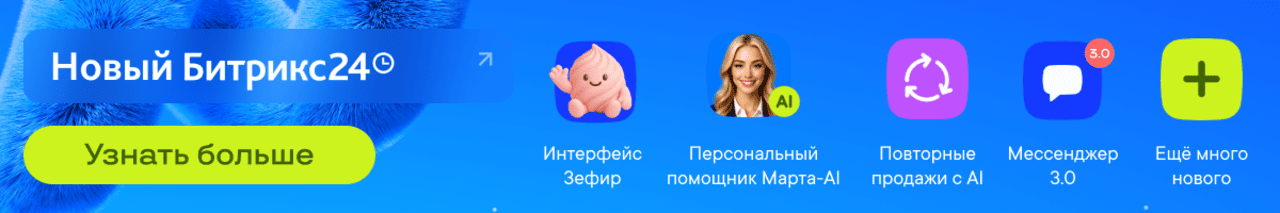 Главные темы этого релиза — простота, удобство и искусственный интеллект в процессах. Перепридумали концепцию продукта и интерфейс, сделали мессенджер центром совместной работы, добавили персонального ассистента Марту AI во все модули и CRM. Больше о новинках Битрикс24 Невесомости — в статье.