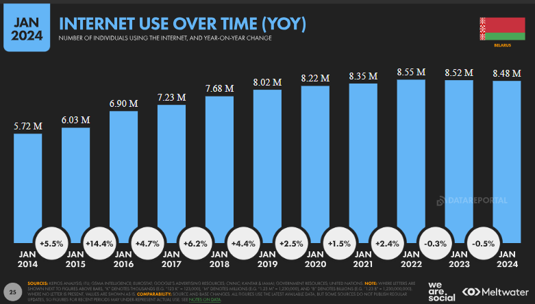 В начале текущего года в Беларуси насчитывалось 8,48 млн интернет-пользователей, а уровень проникновения интернета составлял 89,5%. Количество пользователей сети уменьшилось за год на 0,5% (-39 тыс.).