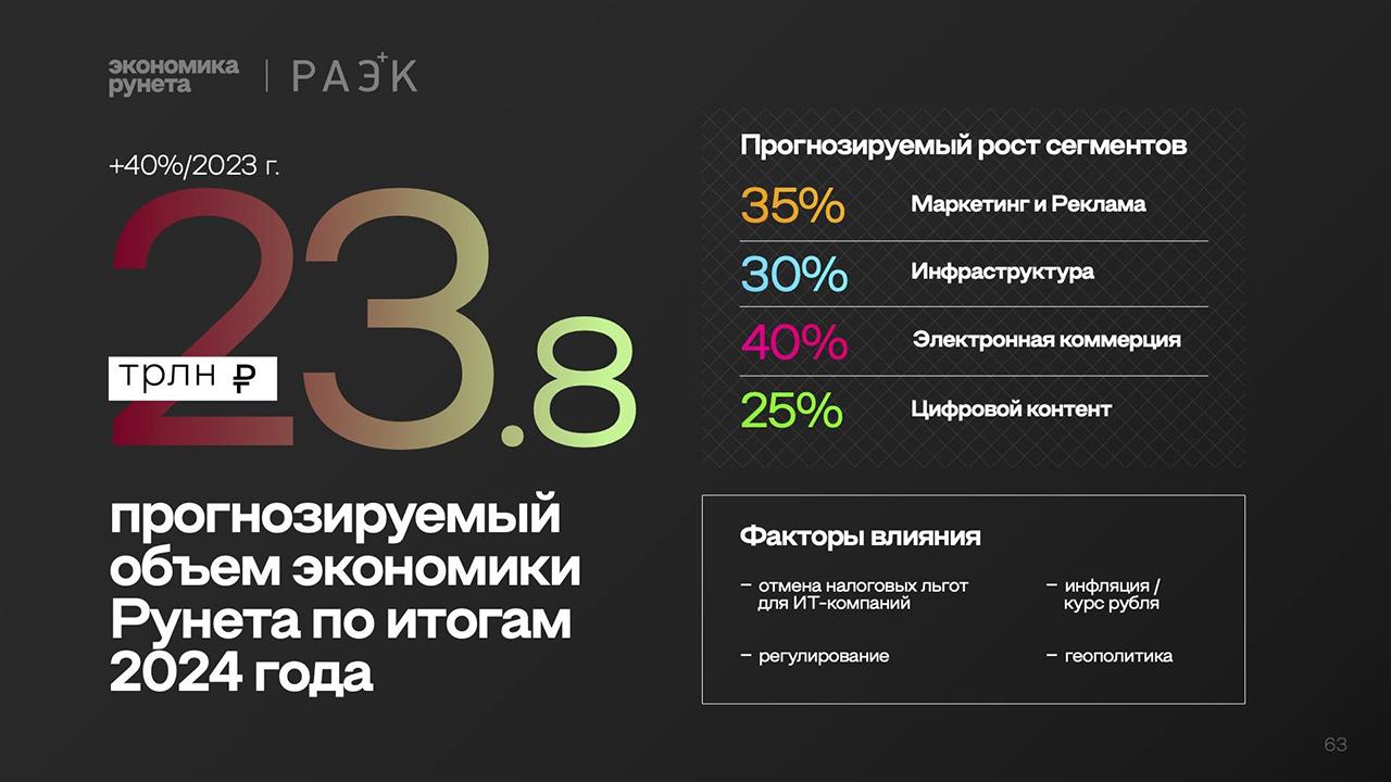 Исследователи ожидают, что по итогам 2024 года экономика Рунета покажет рост на уровне 40% и увеличится в объемах до 23,8 трлн российских рублей ($266,9 млрд):