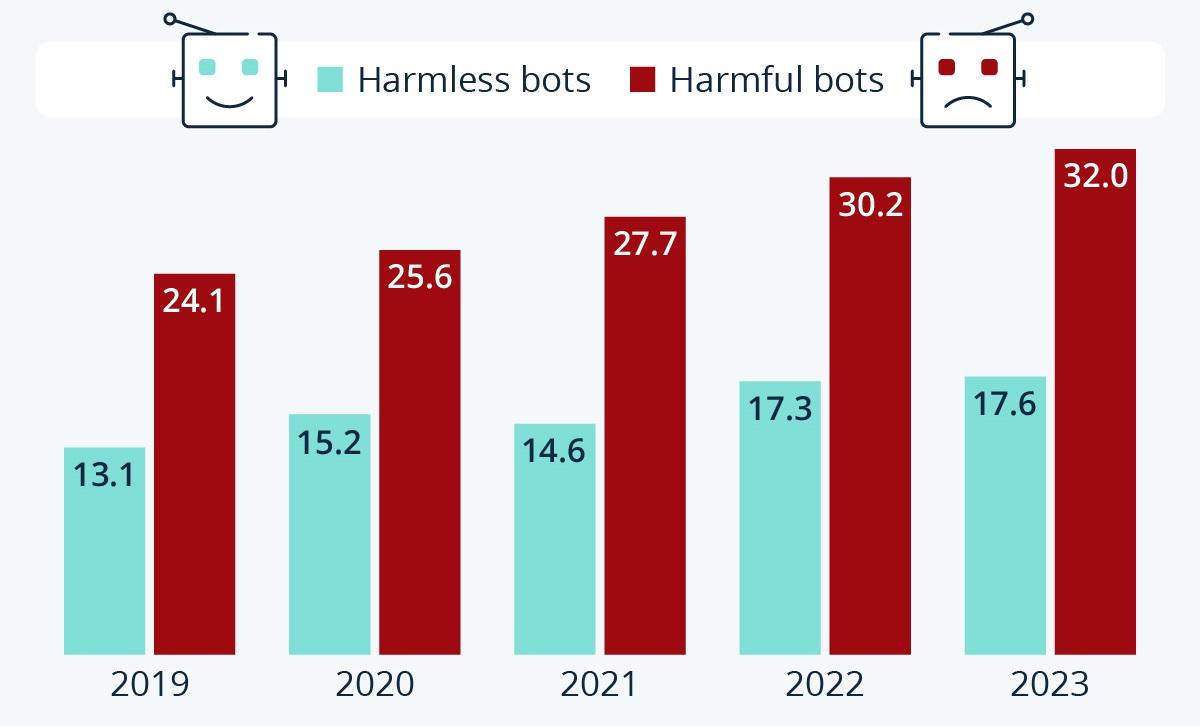Как показывает ежегодный отчет Imperva Bad Bot Report, в 2023 году почти половина всего интернет-трафика (49,6%) была связана с деятельностью разнообразных ботов, в том числе около трети (32%) общего объема трафика – с вредоносными ботами.