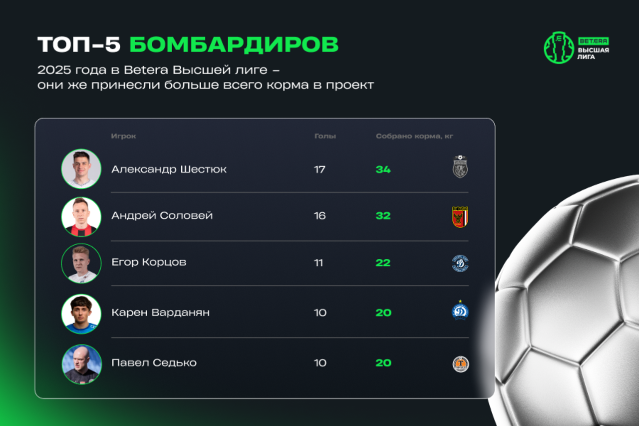 Среди команд Betera Высшей лиги больше всех постарались витебский «МЛ» и мозырская «Славия» – по 53 гола от чемпиона и бронзового призера Беларуси принесли по 106 кг корма для подопечных «ЗООшанса». В бомбардирской гонке не было равных Александру Шестюку из «Ислочи»: его 17 голов превратились в 34 кг корма для пушистых болельщиков!