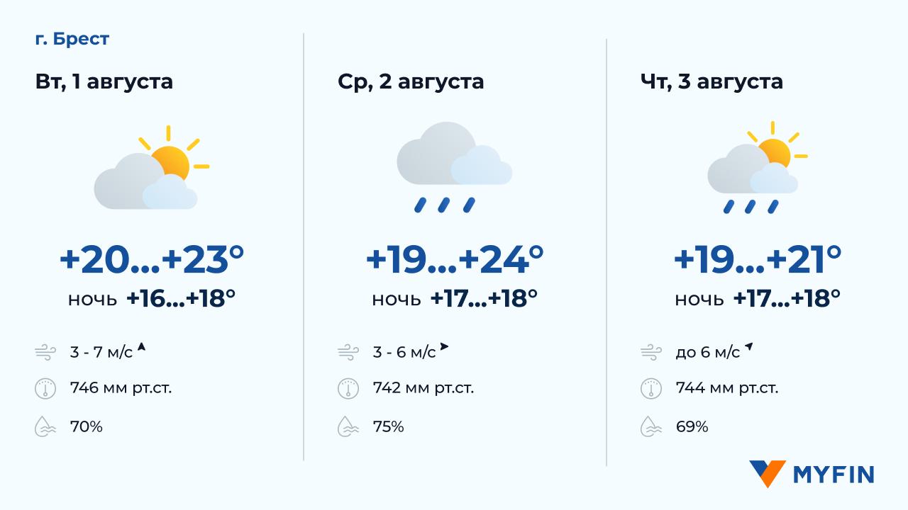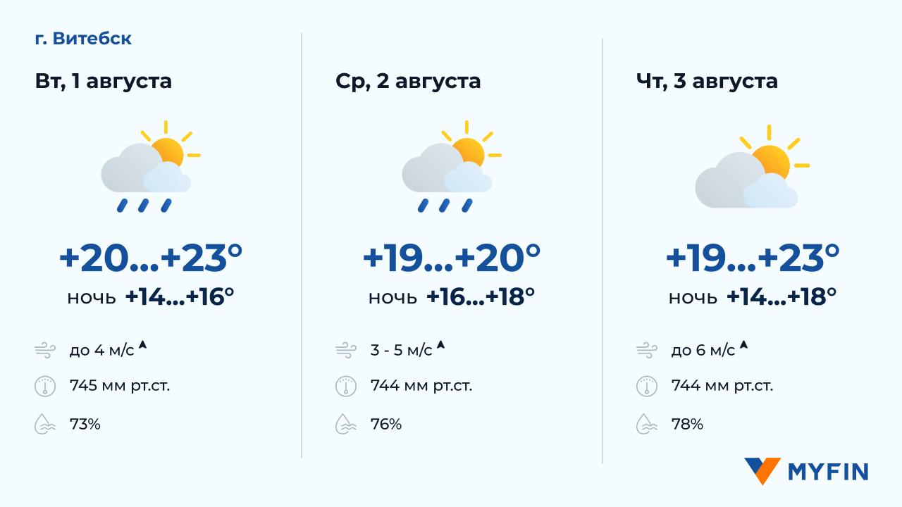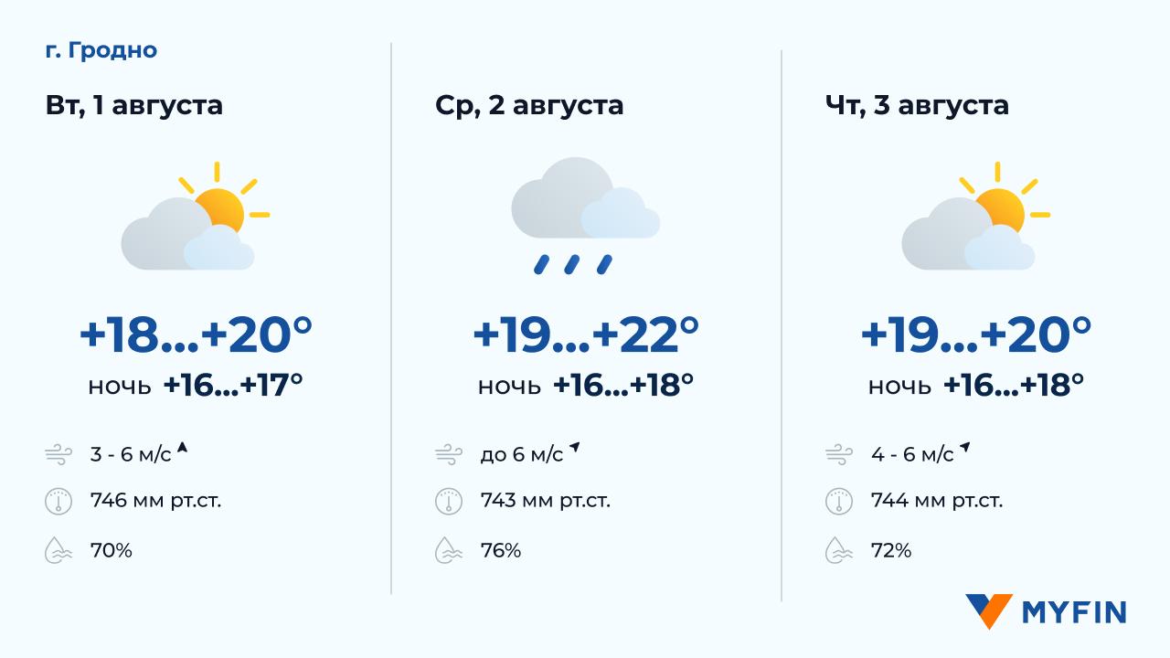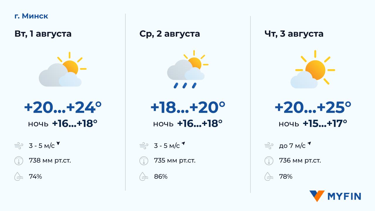 1 августа, по данным Белгидромета, в основном без осадков. Температура воздуха днем около +20..+24°С. Ветер северный, скоростью 3-5 м/c. 2 августа возможны осадки. Температура воздуха ночью +16..+18°С, днем +18..+20°С. Ветер юго-западный, скоростью 3-5 м/c. 3 августа без осадков. Температура воздуха ночью +15..+17°С, днем +20..+25°С. Ветер юго-западный, скоростью до 7 м/c.