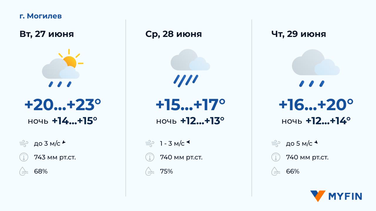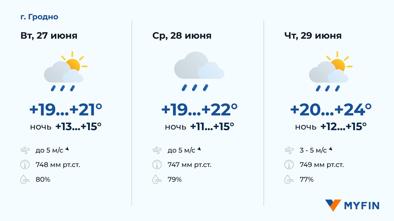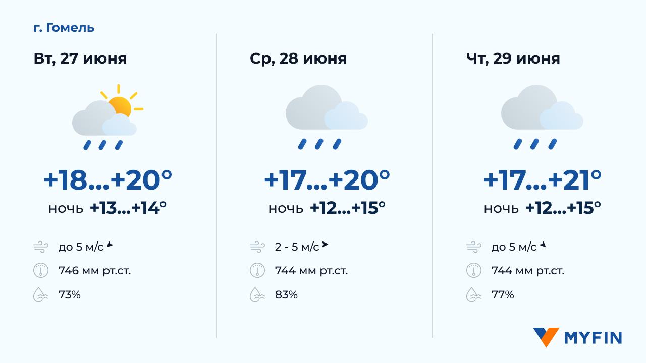 27 июня возможны осадки. Температура воздуха днем +18..+20°С. Ветер северо-восточный, скоростью до 5 м/c. 28 июня возможны осадки. Температура воздуха ночью +12..+15°С, днем +17..+20°С. Ветер западный, скоростью 2-5 м/c. 29 июня ожидаются дожди. Температура воздуха ночью +12..+15°С, днем +17..+21°С. Ветер переменный, скоростью до 5 м/c.