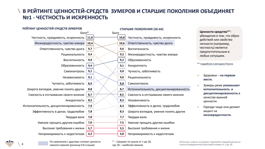 Какие человеческие качества вне конкуренции для зумеров? На первом месте честность и искренность, причем так же приоритетны они и для старших поколений. Отличие в том, что зумеры больше ценят жизнерадостность и чувство юмора, а люди более старшего возраста – ответственность и чувство долга.