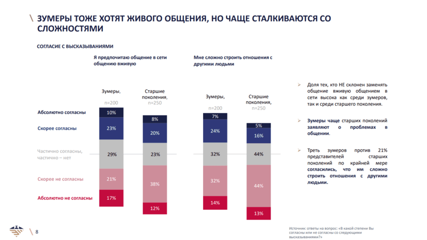 То, что зумеры значительно меньше, чем старшие респонденты, предпочитают общаться вживую, а охотнее выбирают онлайн-общение – совсем не правда. Зумеры тоже хотят живого общения, но чаще сталкиваются со сложностями: треть зумеров против 21% старших поколений согласились, что им сложно строить отношения с другими людьми.