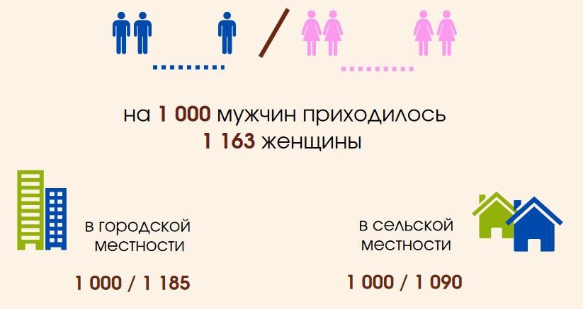 На 1 тысячу мужчин в стране приходится 1163 женщины. При этом в сельской местности это соотношение более уравновешено – 1000 мужчин на 1090 женщин, а в городской – на 1000 мужчин приходится 1185 женщин.