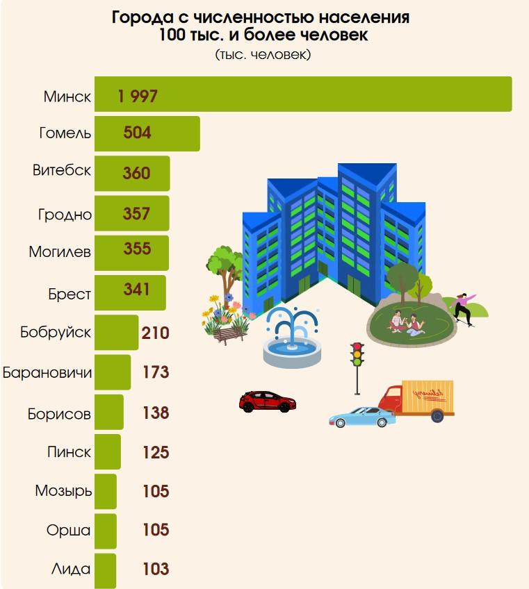 Больше всего населения проживает в Минске – 1997 тыс., на втором и третьем местах идут Гомель и Витебск – 504 тыс. и 360 тыс.