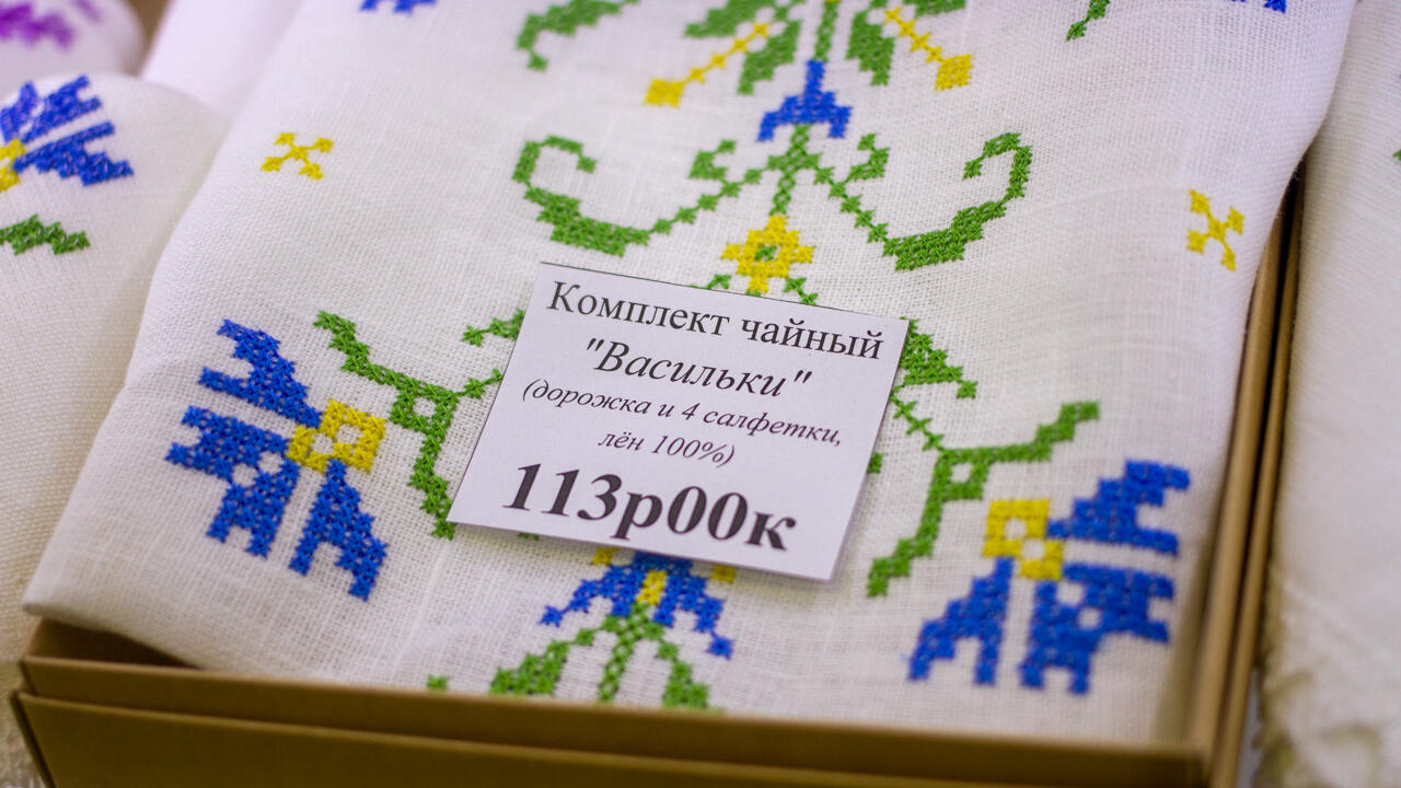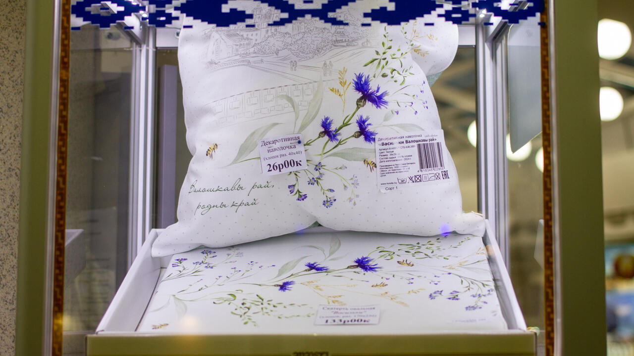 Также, по словам продавца, большой популярностью пользуется текстиль с васильками. В этом же павильоне можно приобрести прихватки, скатерти, полотенца и даже чехол-грелку для чайника.