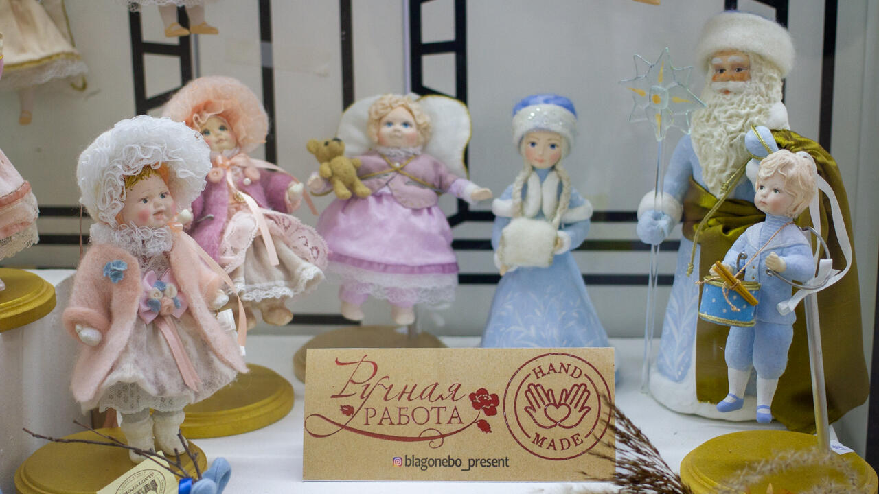 Поражают своим количеством деталей куклы в дизайнерском исполнении от студии монастыря «Благодатное небо». Делают их по старинной технологии из ваты и клейстера (клей на основе муки и крахмала). Лица и руки изготавливают из каменной массы, а расписываются такие куклы вручную. Две абсолютно одинаковые куклы найти невозможно. Что по цене? Например, фигурка Деда Мороза стоит 140 рублей. Много ли это для абсолютно оригинального изделия ручной работы?