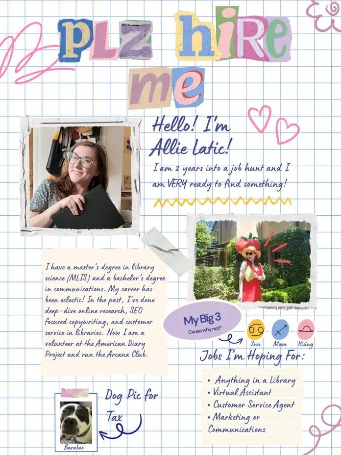 В приложении Canva девушка сделала картинку с подписью «Пожалуйста, наймите меня» – и прикрепила свое фото, снимок своей собаки Барабу, указала свой знак зодиака и прочую информацию, которую в резюме обычно не указывают.
