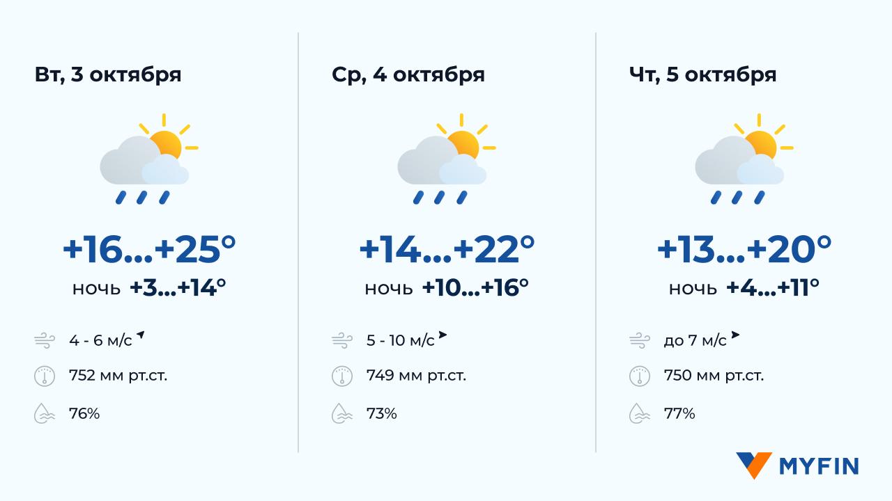 4 октября, в среду, на большей части территории республики пройдут кратковременные дожди, в отдельных районах возможны грозы. Ветер юго-западный, западный порывистый, ночью местами, днем на большей части территории республики сильный порывистый. Температура воздуха минимальная ночью +10..+16°С, максимальная днем составит от +14°С по северо-западу до +22°С по юго-востоку республики.