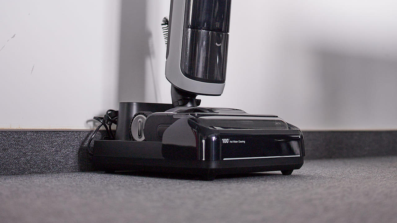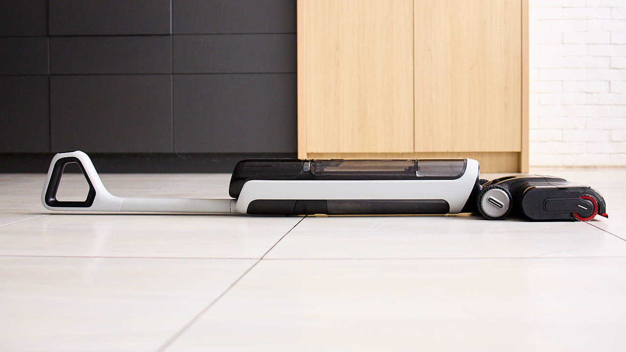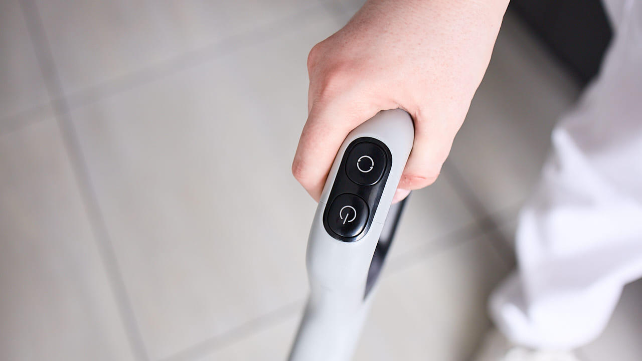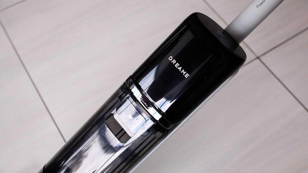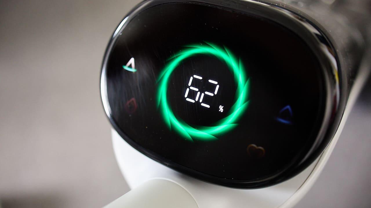 Для удобства производитель специально сбалансировал конструкцию и расположил резервуар для грязной воды объемом 650 мл ближе к основанию пылесоса. На верхней части емкости – дисплей с уровнем заряда устройства, заданным режимом уборки и температурой (при использовании функции очистки пола с помощью горячей воды).