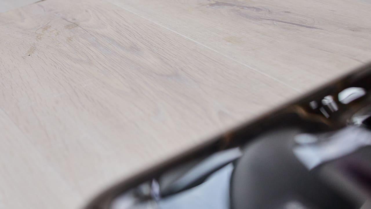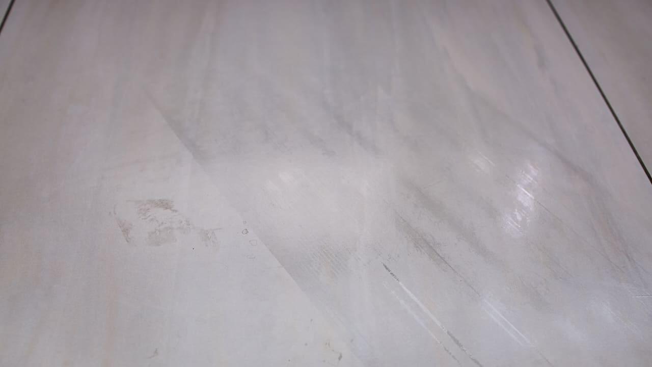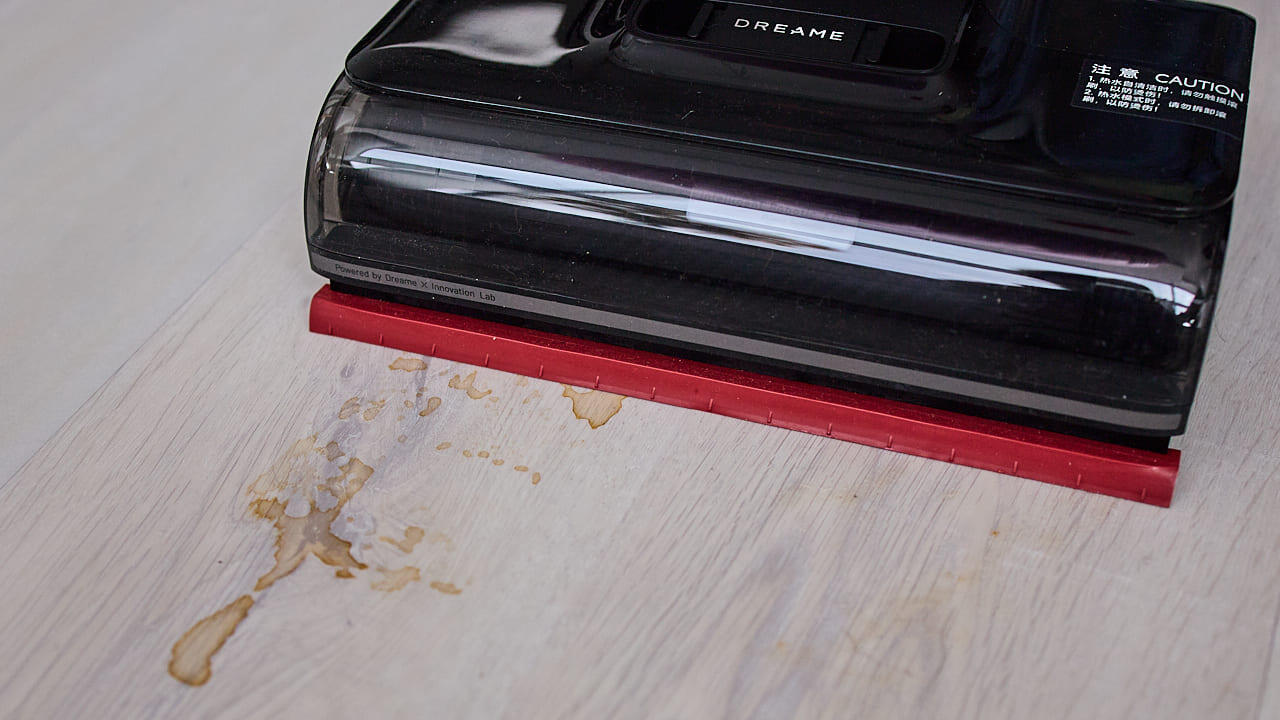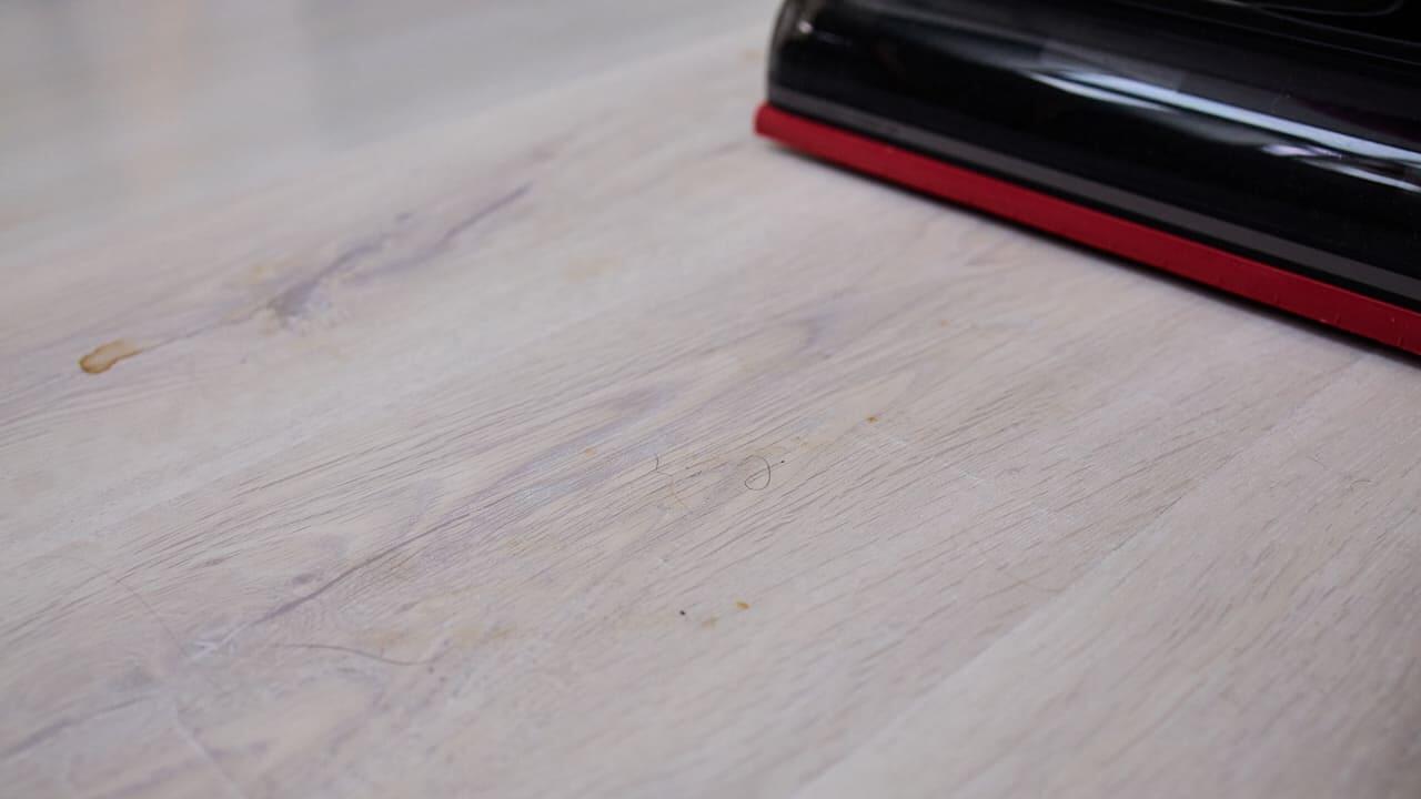 Мы приготовили следы от варенья, разводы от масла, застарелые капли чая – обычно от них остаются следы после уборки. Для усложнения задачи гладкую поверхность заменяем на кварц-винил с фрезеровкой под дерево.Включаем «горячий режим», ждем, пока пылесос подогреет воду, и приступаем. С масляными пятнами гаджет справился в два счета – как будто на полу вовсе не было плотной жирной пленки. Чтобы окончательно убрать следы варенья и чая, мы прокатили его по загрязнениям несколько раз. Результат – идеально чистая поверхность.