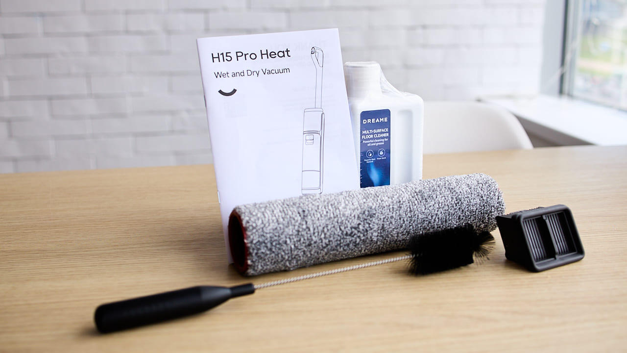 Dreame H15 Pro Heat, как и другие модели производителя, поставляется в добротной коробке с картонными вкладышами и мешками для защиты девайса. В комплектацию входят: