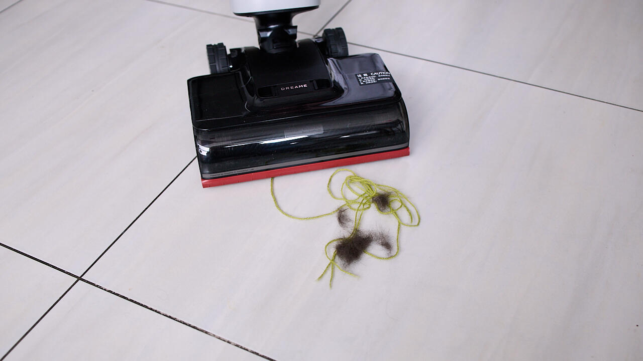 Опробуем мощность двигателя на ковролине, а скребок – на шерсти и пряже, которая имитирует длинные волосы для наглядности. Для системы GapFree мы приготовили стык цоколя в шкафу на кухне. Заезжаем на ковролин – здесь нам нужно убрать мелкие крошки. Против ожиданий, пылесос не буксует – наоборот, устремляется вперед и засасывает даже мелкий мусор.Далее распределяем по полу пряжу и шерсть. Большую часть девайс «проглотил» мгновенно, мы едва успели сфотографировать «до» и «после». Самый плотный и объемный ком шерсти пылесос захватил со второй попытки.