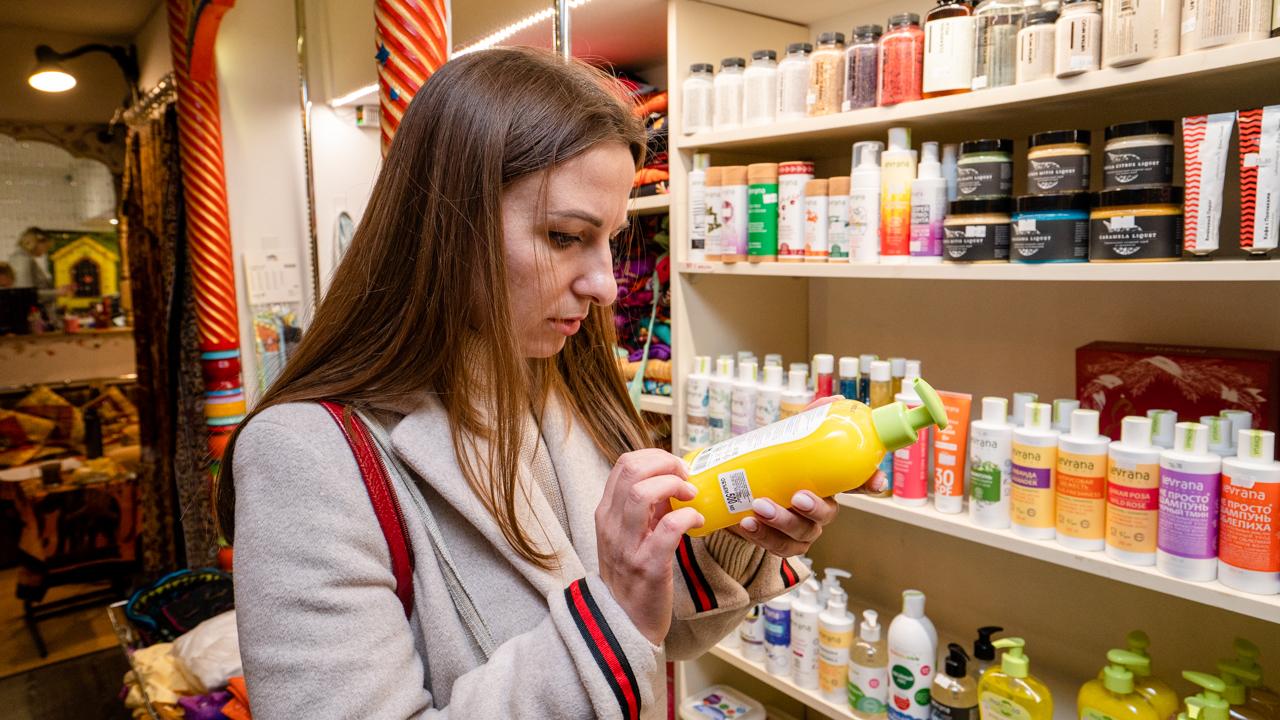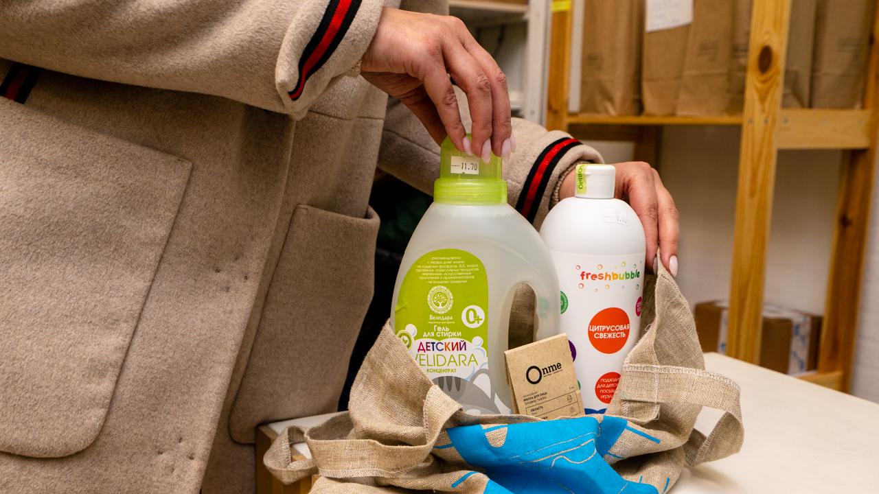 Закупаться будем бытовой химией. Раньше чистящие средства для дома героиня приобретала в сетевых магазинах, ориентируясь на цены средней линейки. Насколько состав продукта безвредный, есть ли аллергены и перерабатывается ли упаковка – все это не учитывалось. Ситуация изменилась с рождением ребёнка. Теперь девушка старается покупать вещи из натуральных тканей, пользуется многоразовыми альтернативами, безвредной косметикой.
