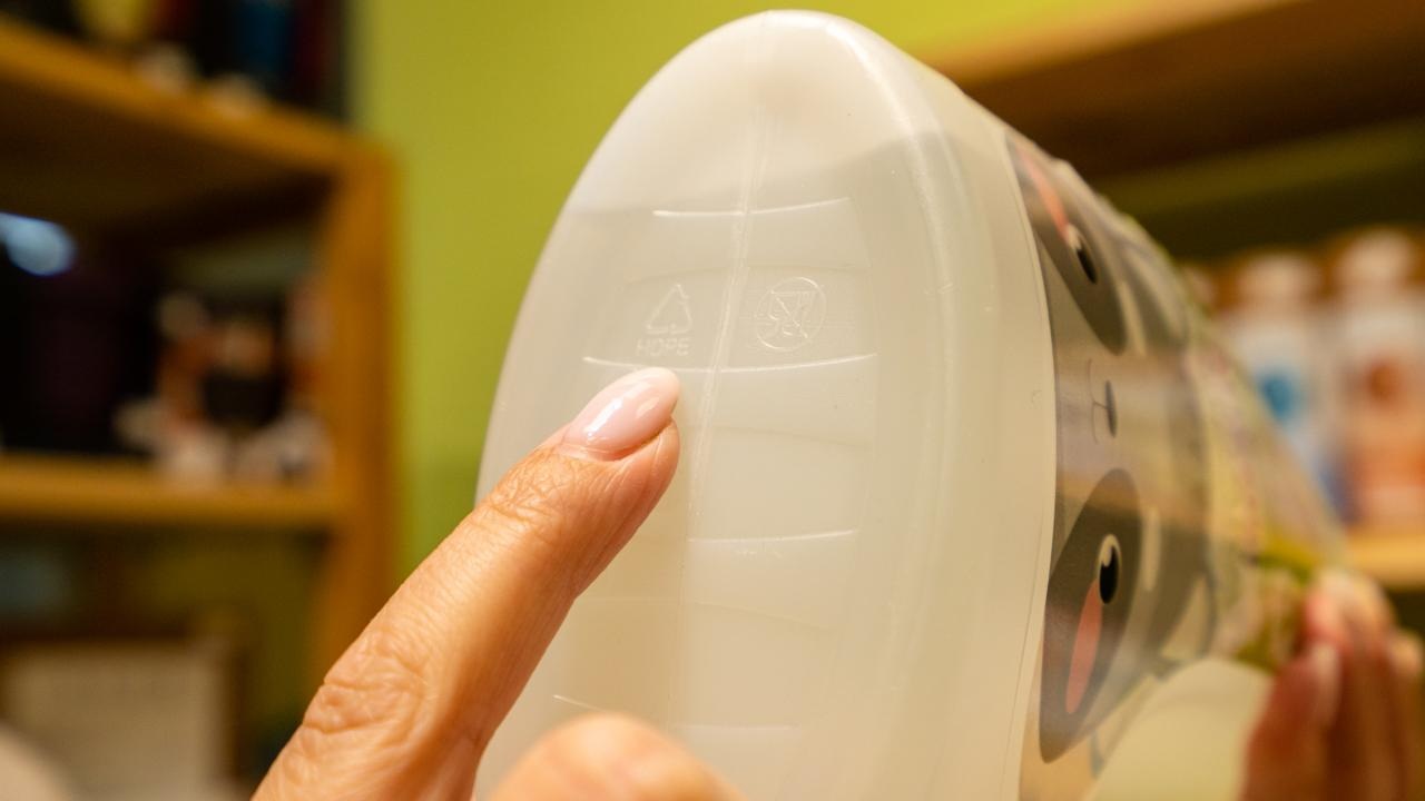 – В таком случае одной тарой мы можем пользоваться долгое время. Вообще надо покупать всю эту химию в перерабатываемых упаковках, ― героиня показывает на донышко бутылки, где может ставиться отметка о перерабатываемости. – В Беларуси может быть переработан пластик 1, 2, 4, 5 типов. Искать тип пластика следует на этикетке или на дне емкости, значок – треугольник в виде стрелки.