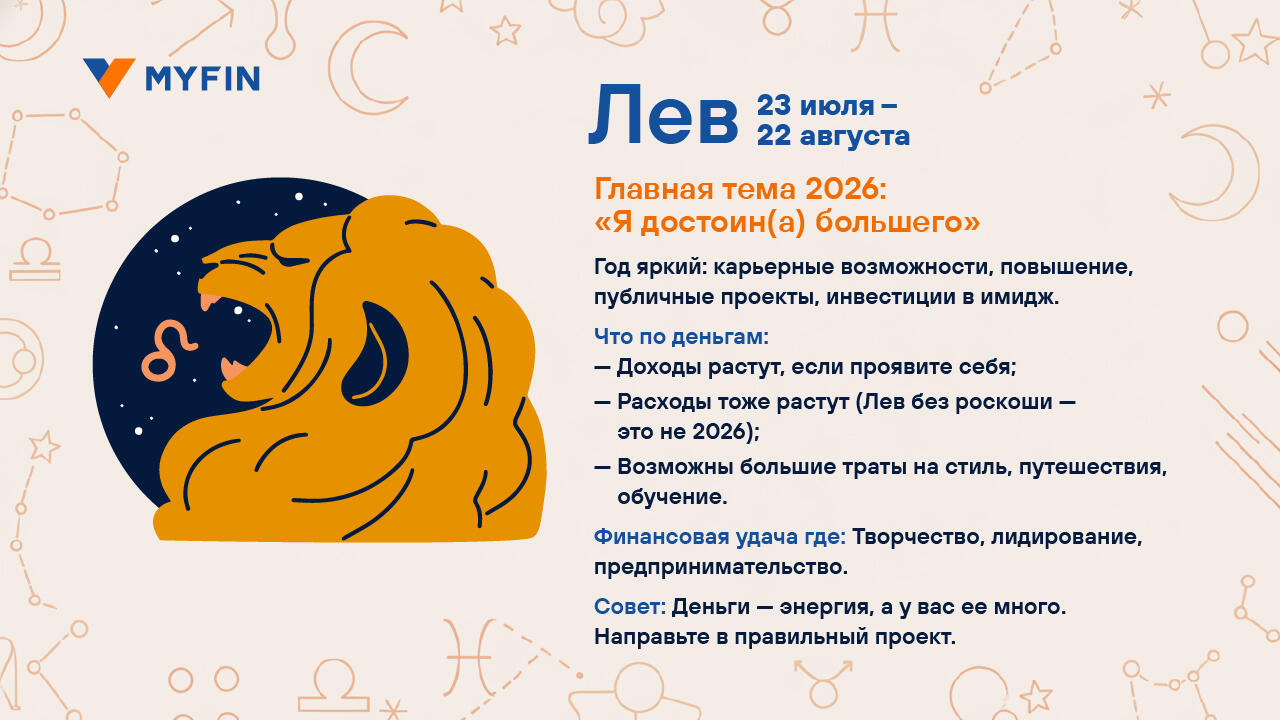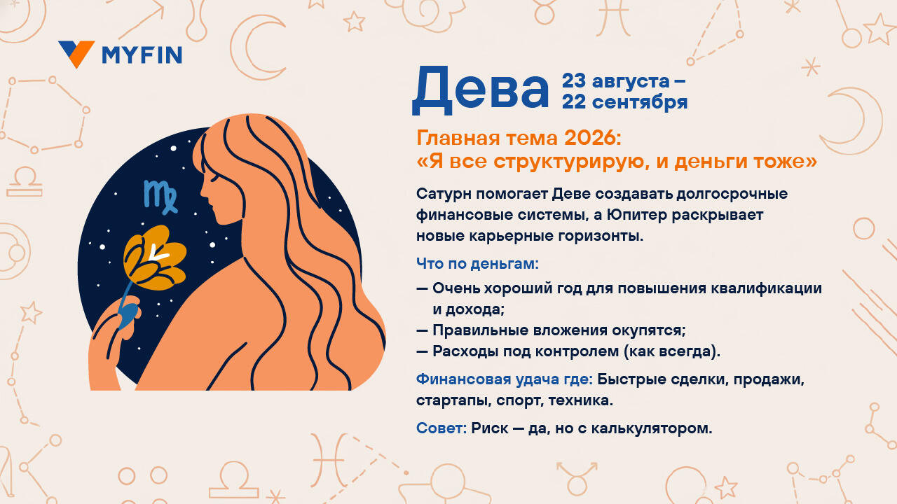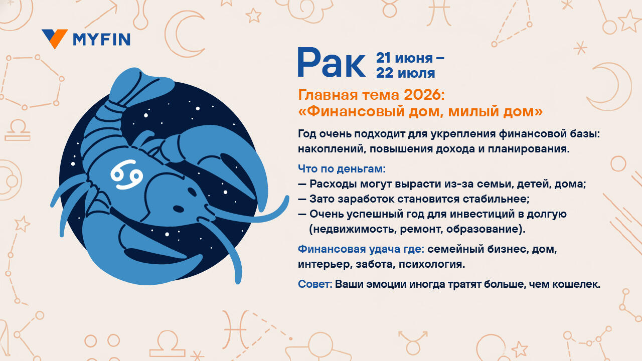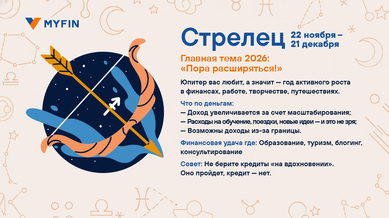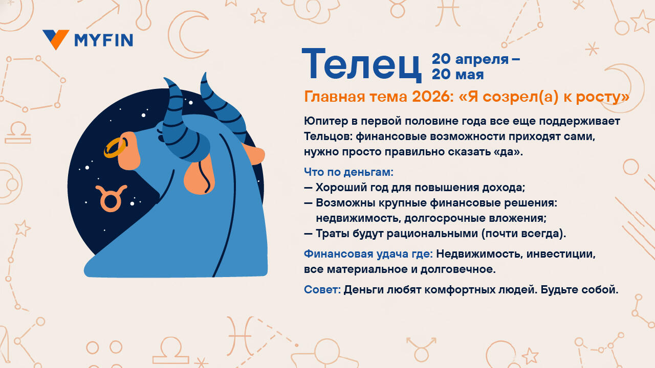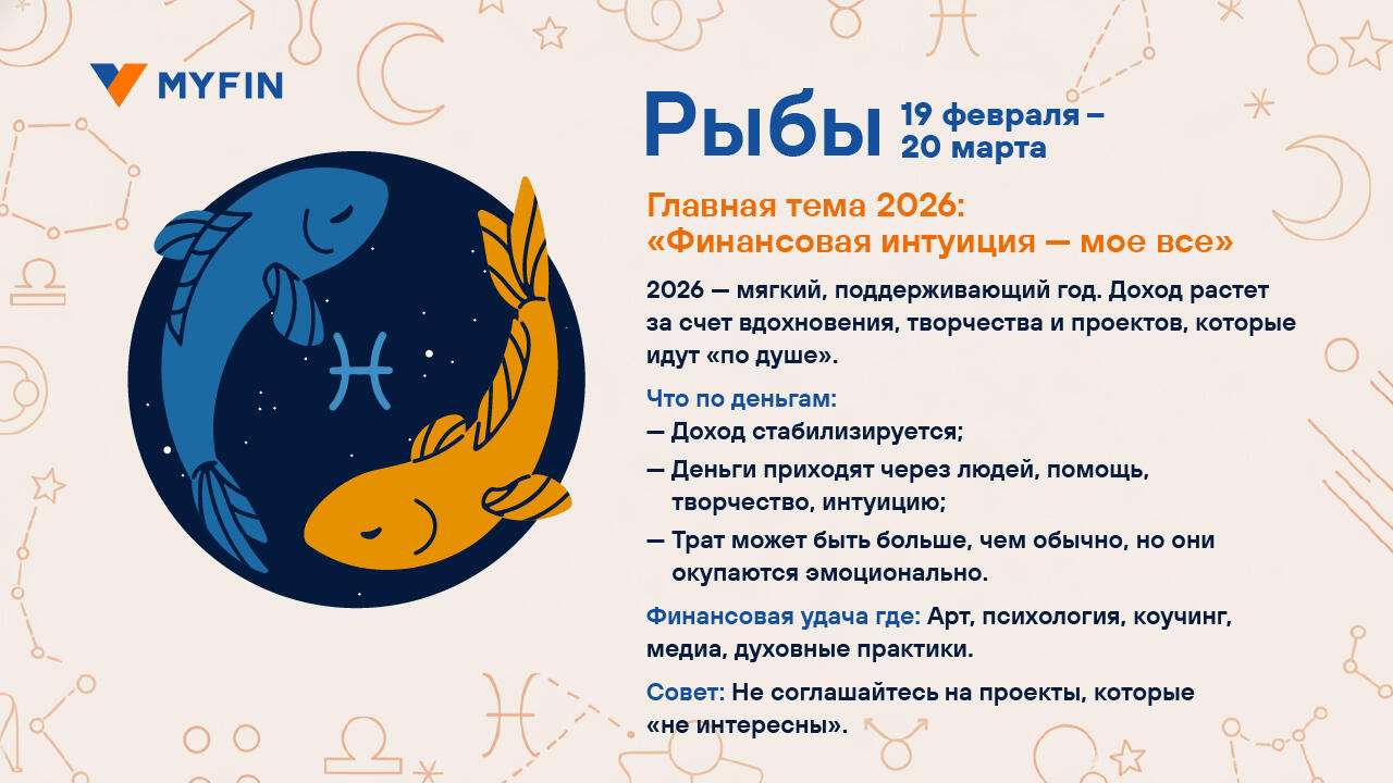 Вы верите в гороскопы? Мы, пожалуй, — да. Особенно когда звезды обещают что-нибудь приятное для кошелька. Myfin.by попросил астролога Ксению Фоменко составить финансовый гороскоп на 2026 год. Читайте, вдохновляйтесь и отмечайте в календаре дни, когда шансы на удачу особенно высоки. Вдруг именно тогда и стоит купить лотерейный билет.