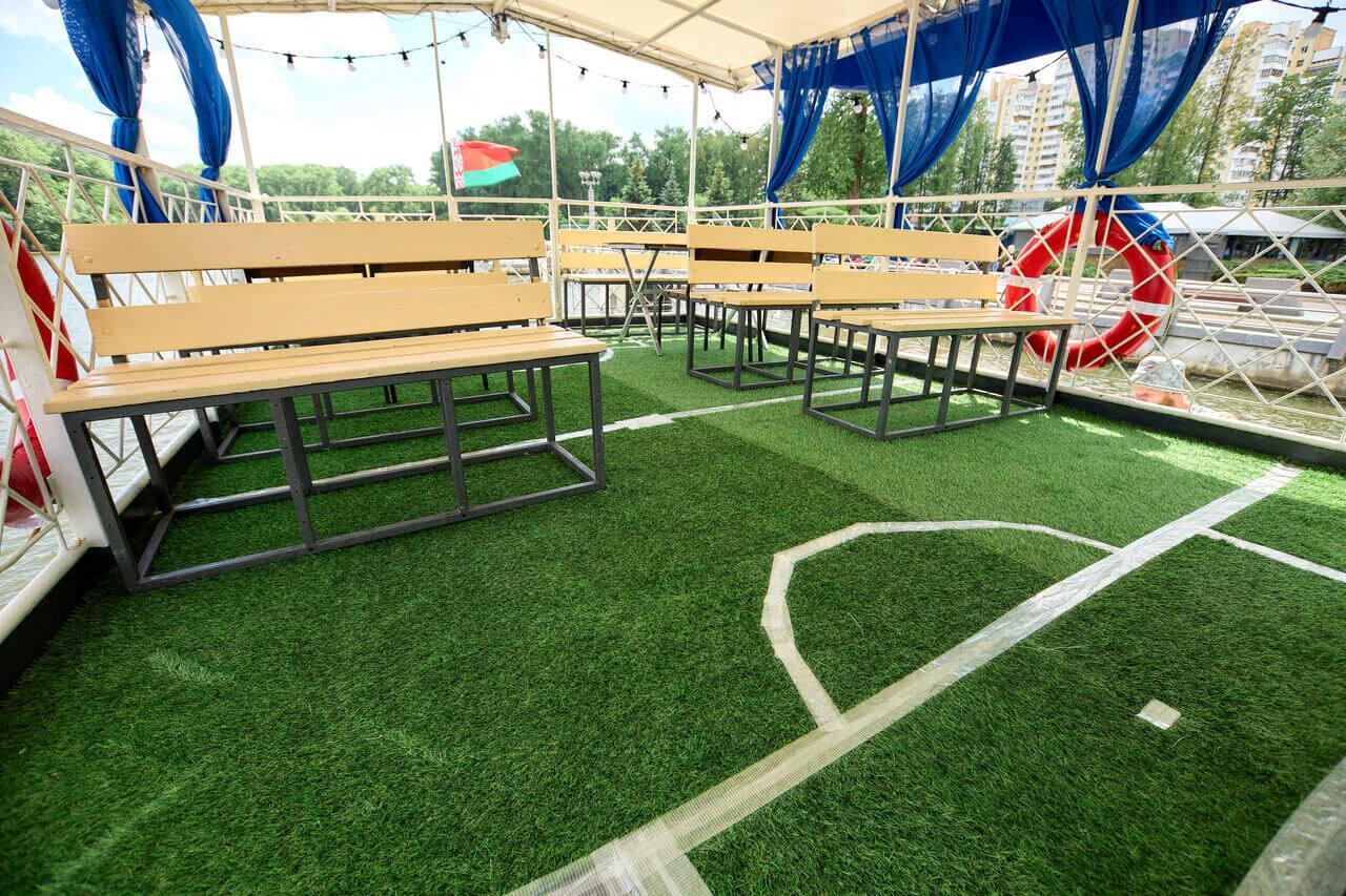 Теплоход “Свислочь” оформлен тематически в бело-зеленых цветах. Оба борта украшают надписи: “Футбол”, “Гооол”, “Все на борт”, а рядом вывешены 24 футбольных мяча, которые символизируют общее количество команд участниц чемпионата. На верхней палубе постелен искусственный газон, который оформлен в виде мини-футбольного поля, а на носу корабля находится большой фирменный логотип компании Betera. Праздничной атмосферы добавляет приветливая команда корабля, которая с радостью ответит на вопросы гостей.