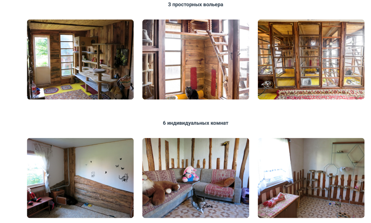 Судя по фотографиям на сайте, для постояльцев выделен целый дом. Кошкам и собакам предлагают отдельные комнаты и просторные вольеры, также есть уличный вариант содержания. Ежедневные прогулки доступны на огороженной территории или по желанию хозяина на лугу неподалеку.