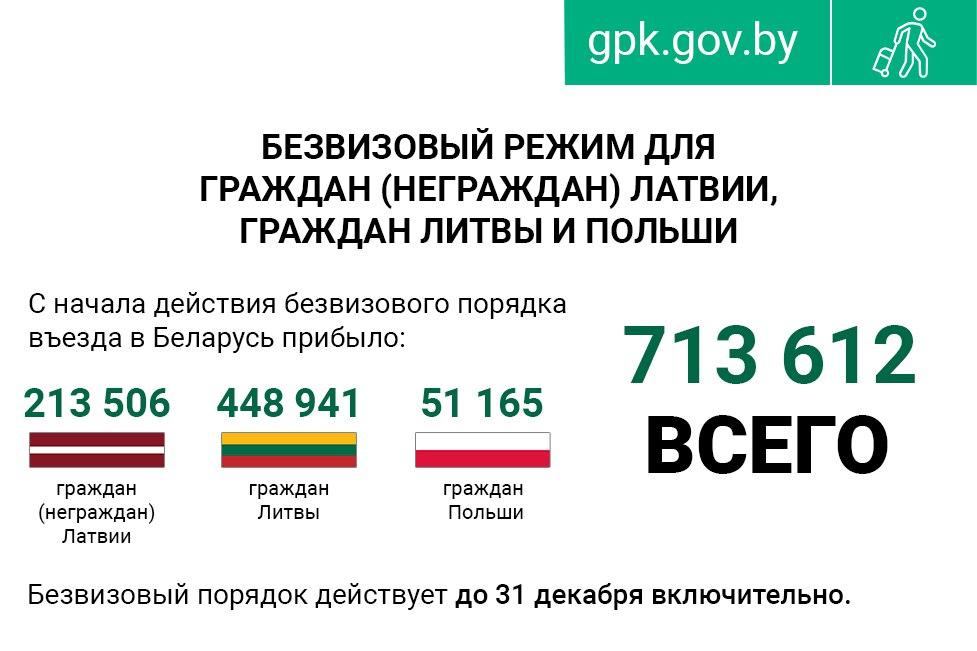 По данным Госпогранкомитета Беларуси, с начала действия безвизового режима в Беларусь проследовало 713 612 иностранцев. Это 448 941 гражданин Литвы, 50 075 неграждан и 163 431 гражданин Латвии, а также 51 165 граждан Польши.