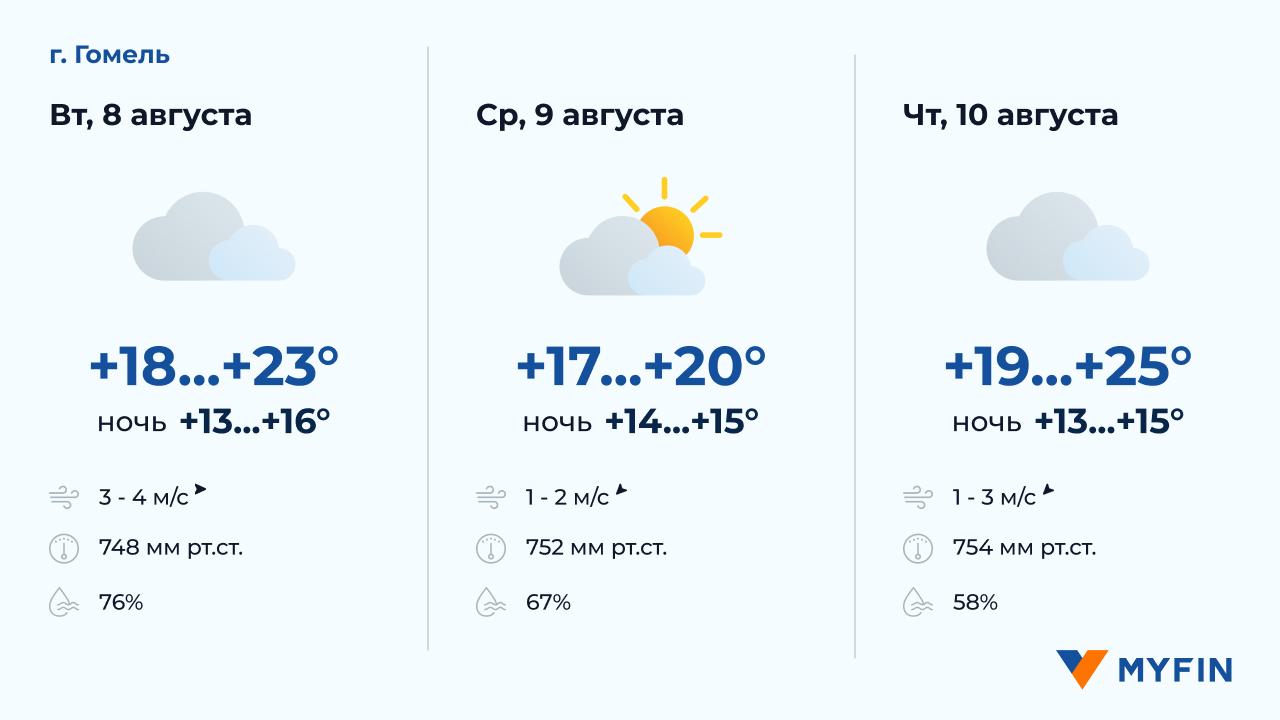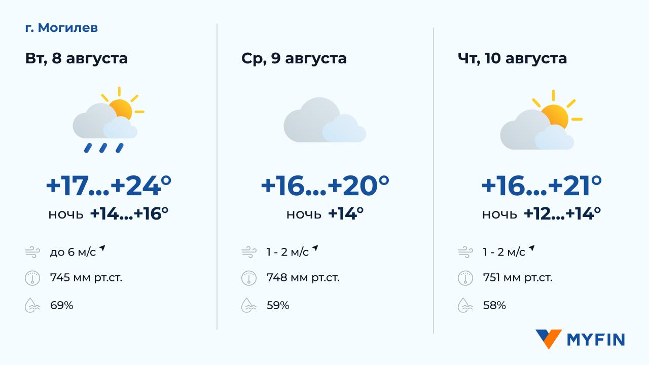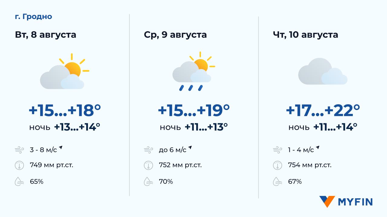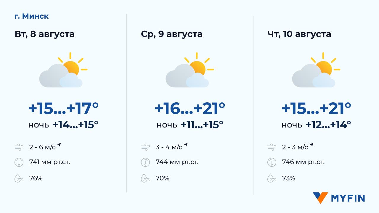 8 августа, по данным Белгидромета, в основном без осадков. Температура воздуха днем около +15..+17°С. Ветер юго-западный, скоростью 2-6 м/c. 9 августа без осадков. Температура воздуха ночью +11..+15°С, днем +16..+21°С. Ветер юго-западный, скоростью 3-4 м/c. 10 августа без осадков. Температура воздуха ночью +12..+14°С, днем +15..+21°С. Ветер юго-западный, скоростью 2-3 м/c.