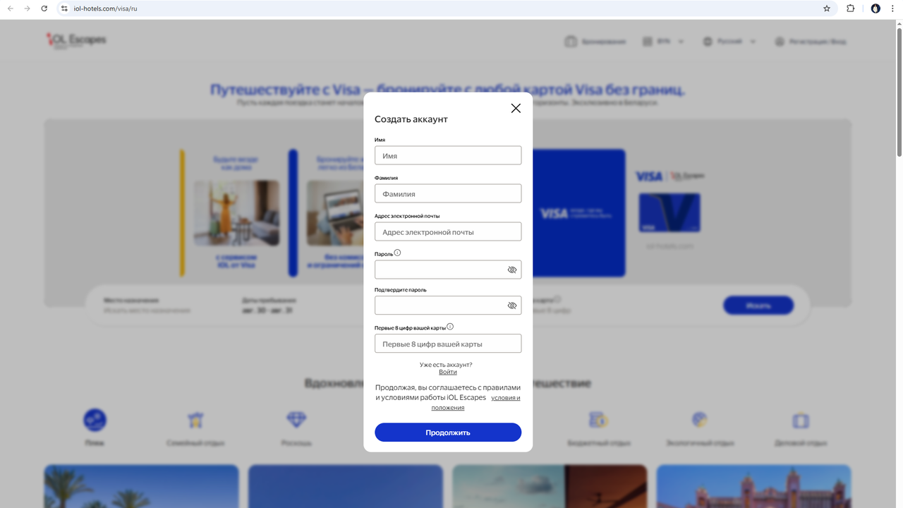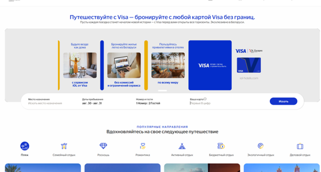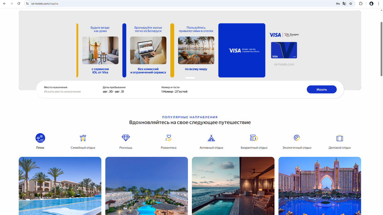 Онлайн сервис iol-hotels.com от Visa позволяет путешественникам – держателям банковских карт Visa бронировать и оплачивать жилье в Беларуси и по всему миру легко, удобно без ограничений и комиссий. Это возможность вновь наслаждаться путешествиями мечты, выбирать вдохновляющие travel-форматы и получать преимущества от Visa.