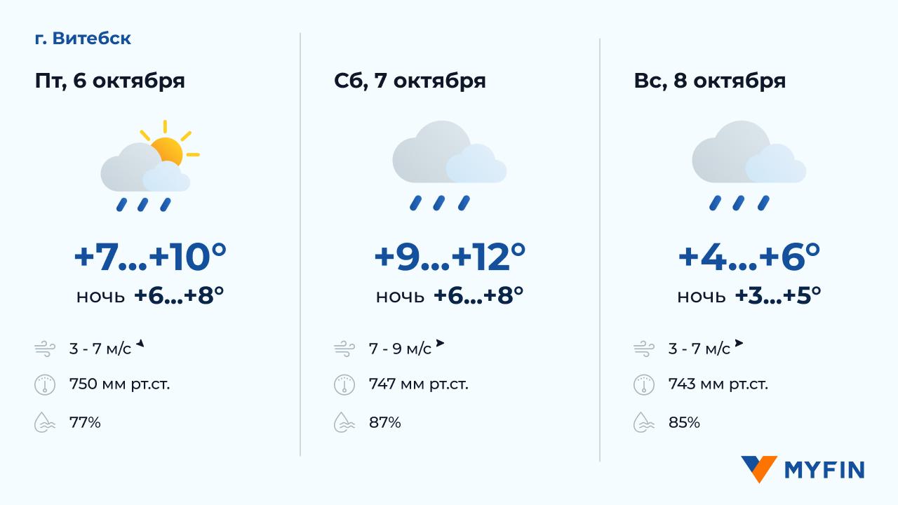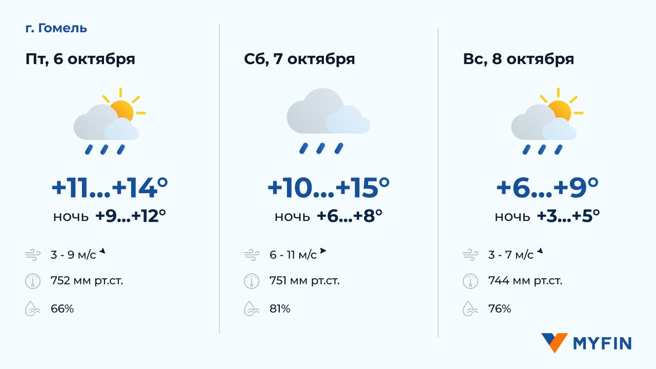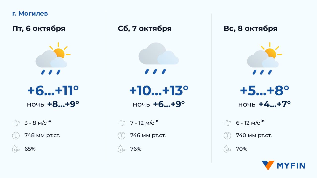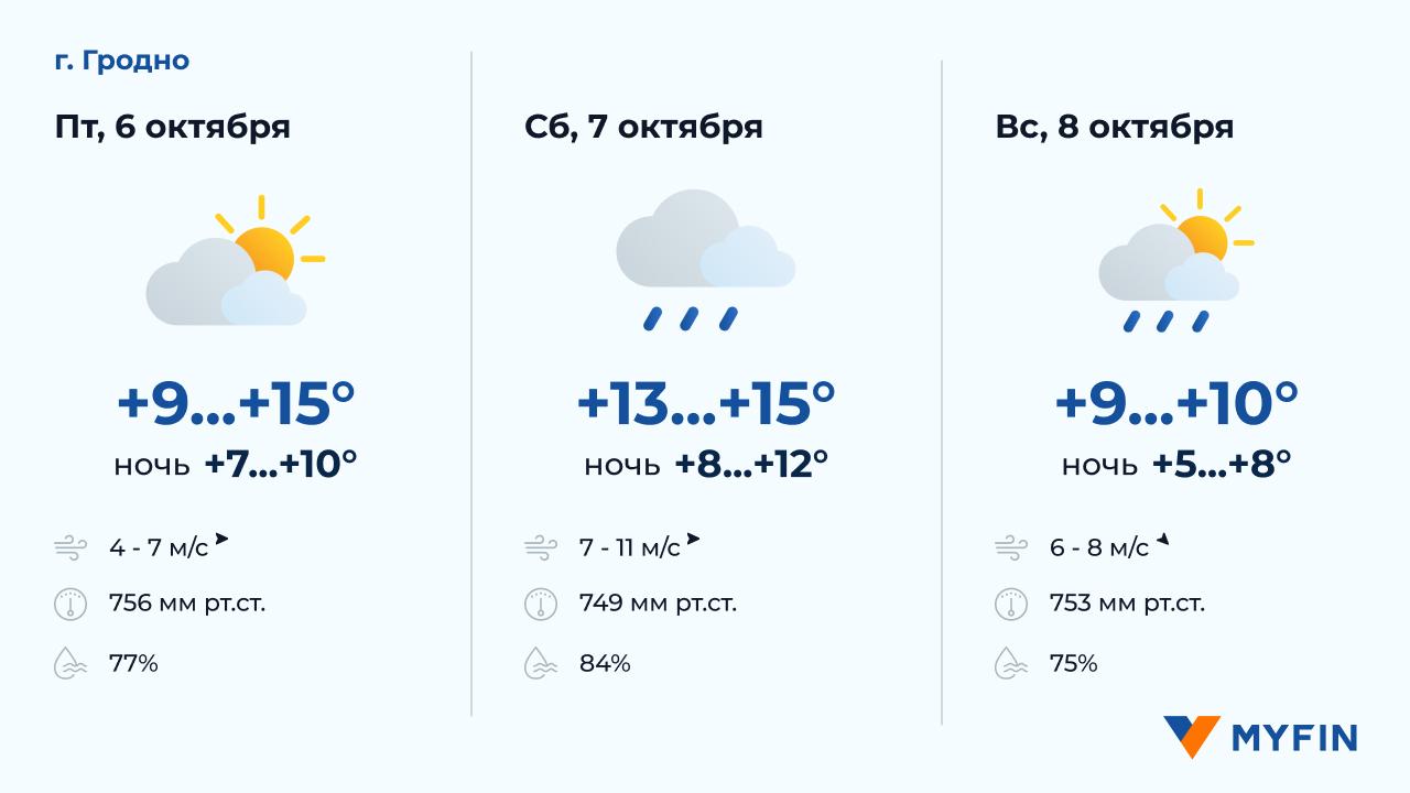 6 октября, по данным Белгидромета, могут быть осадки. Температура воздуха днем +8..+12°С. Ветер северо-западный, скоростью 3-8 м/c. 7 октября будут дожди. Температура воздуха ночью +5..+10°С, днем +11..+13°С. Ветер западный, скоростью 7-11 м/c. 8 октября будут осадки. Температура воздуха ночью +3..+5°С, днем +7..+8°С. Ветер северо-западный, скоростью 3-8 м/c.