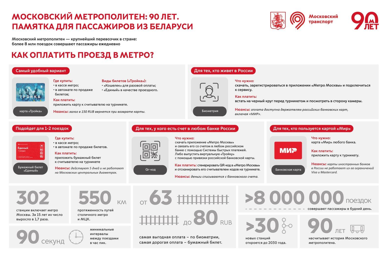 Проезд в московском метро с июня стоит от 63 до 80 российских рублей (от 2,3 до 3 BYN) в зависимости от зоны (центр или пригород) и способа оплаты. Дешевле всего – по биометрии, дороже – по бумажному билету. Белорусам удобнее и выгоднее платить по «Тройке» с билетом «Кошелек».