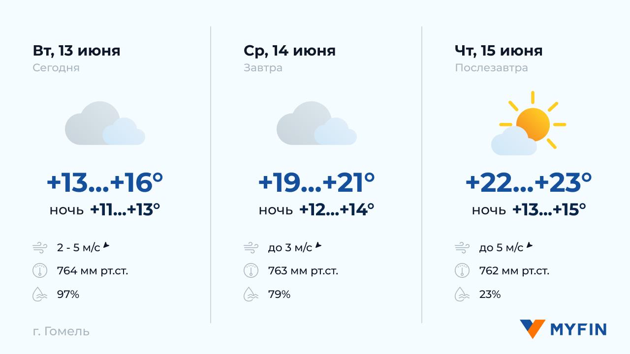 В Гомеле сегодня, 13 июня, без осадков. Температура воздуха утром +11°С, днем +13°С. Ветер северо-восточный, скоростью 2-5 м/c. 14 июня без дождей. Температура воздуха ночью +13°С, днем +21°С. Ветер северо-восточный, скоростью до 3 м/c. 15 июня без осадков. Температура воздуха ночью +13°С, днем +22°С. Ветер северо-восточный, скоростью до 5 м/c.