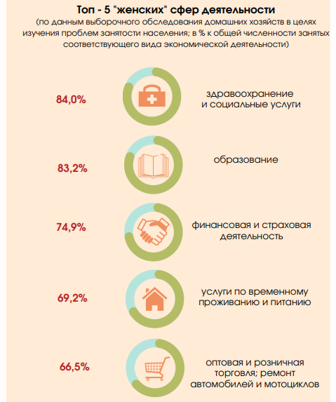 Больше всего женщин занято в сфере здравоохранения и социальных услуг, а также в образовании.