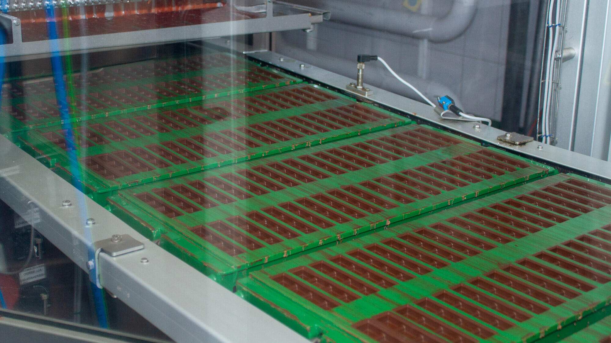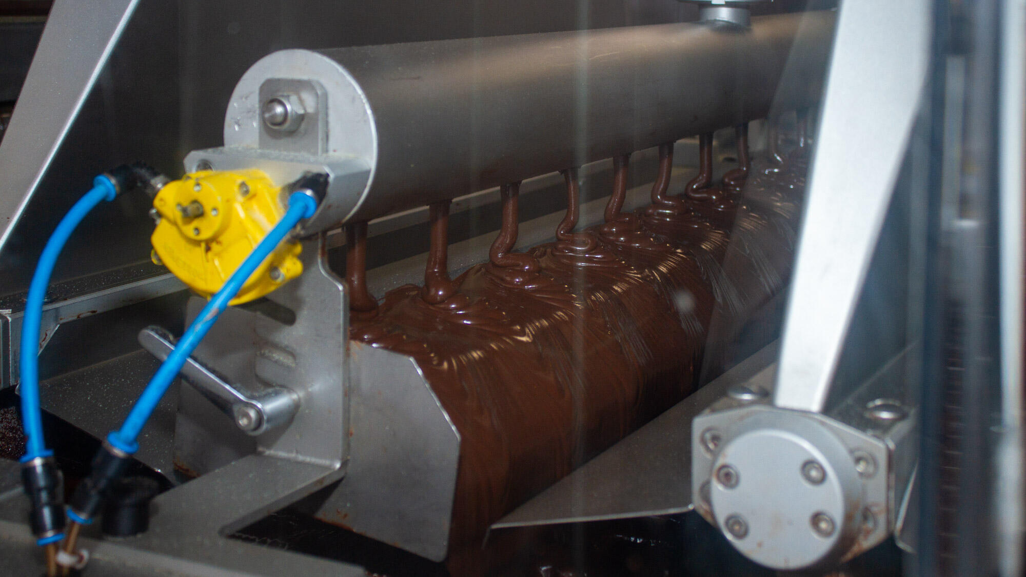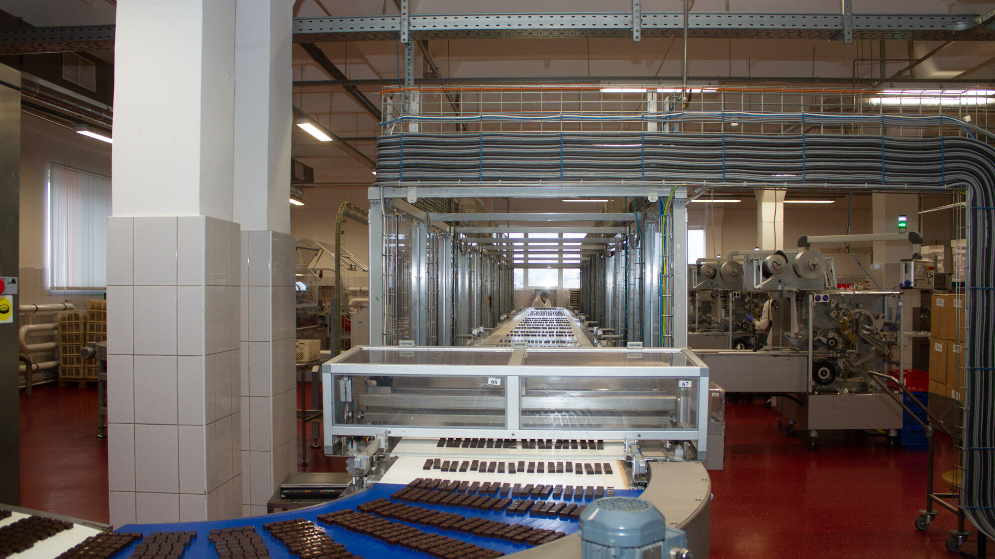 Какао-бобы в Беларуси не растут, но все остальные ингредиенты – местного производства. За прозрачным стеклом – дозирующая станция, аккуратно распределяющая шоколад в подогретые формы. Температура шоколадной массы – около 30 °C. Затем в теплый шоколад погружается поршень, охлажденный до –23–25°C. Перепад температур достигает 53–55 °C! За счет этого шоколад мгновенно застывает. Раньше этот процесс занимал 30–40 минут, а теперь – всего секунду!