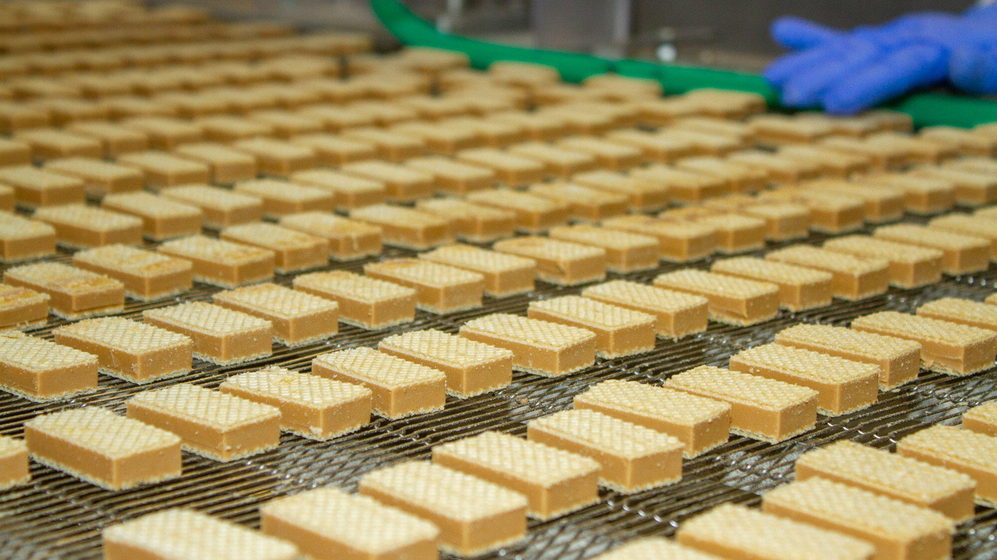 Далее мы попадаем в цех, где производят вафельные конфеты. Здесь всё начинается с замеса теста. Густая масса постепенно превращается в основу будущих вафель. Затем тесто отправляется в печь, где за две минуты выпекаются 32 вафельных листа.