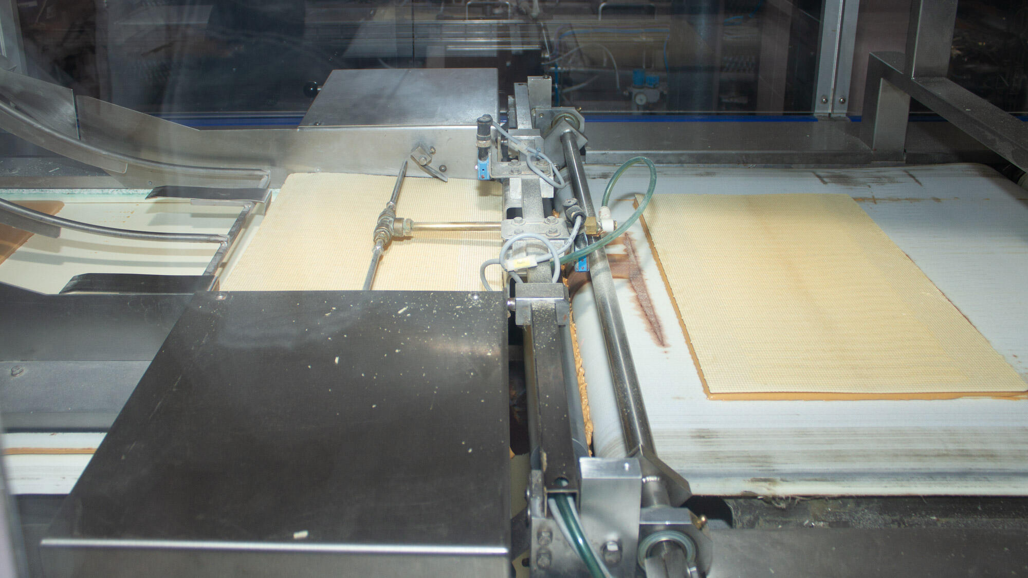 Далее на тончайший вафельный лист через дозатор наносится слой начинки, затем чередуются вафли и начинка – до пяти слоев в зависимости от рецептуры конфеты.