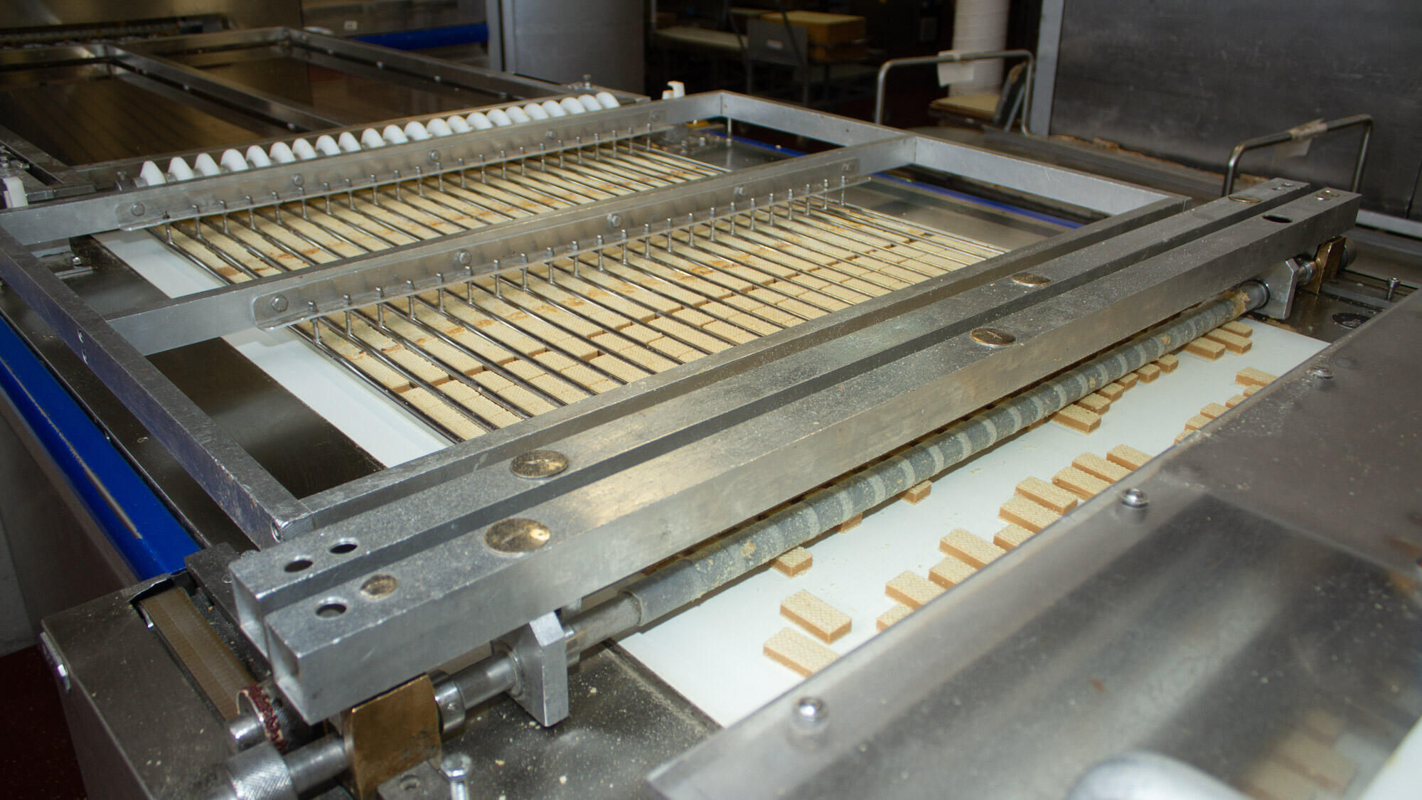 Сначала суфле одним потоком попадает на ленту, где его аккуратно разравнивают специальные барабаны. Благодаря этому оно становится однородным и приобретает красивый глянцевый вид. Затем массу из суфле нарезают на ровные полоски. Каждая из них – будущая конфета.