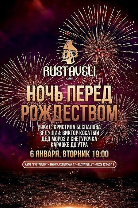 Вечером 6 января в кафе Rustaveli пройдёт рождественская вечеринка с говорящим названием «Ночь перед Рождеством» — вариант для тех, кто хочет встретить праздник не дома, а в компании и с музыкой. В программе заявлены ведущий и артисты, а ещё Дед Мороз со Снегурочкой, так что формат скорее «шумный вечер» с конкурсами и сюрпризами, а не тихий ужин.