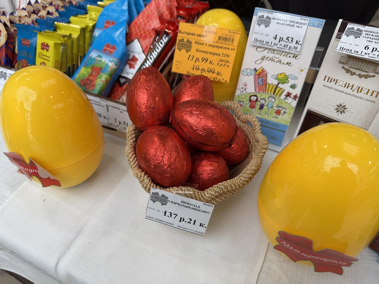 «Коммунарка» представила изобилие шоколадных яиц. За 1 кг десерта в красной фольге просят 137, 21. Впервые фабрика предлагает киндер по-белорусски. Это пластиковое яйцо с сюрпризом, по размерам больше напоминающее страусиное, в котором собраны любимые всеми конфеты. Сейчас позиция на хорошей скидке – 13,99 за штуку.